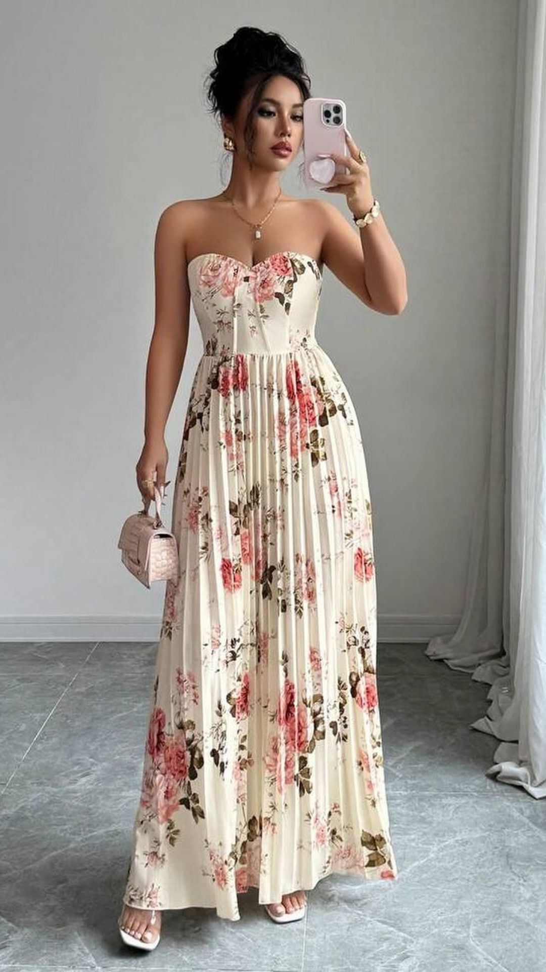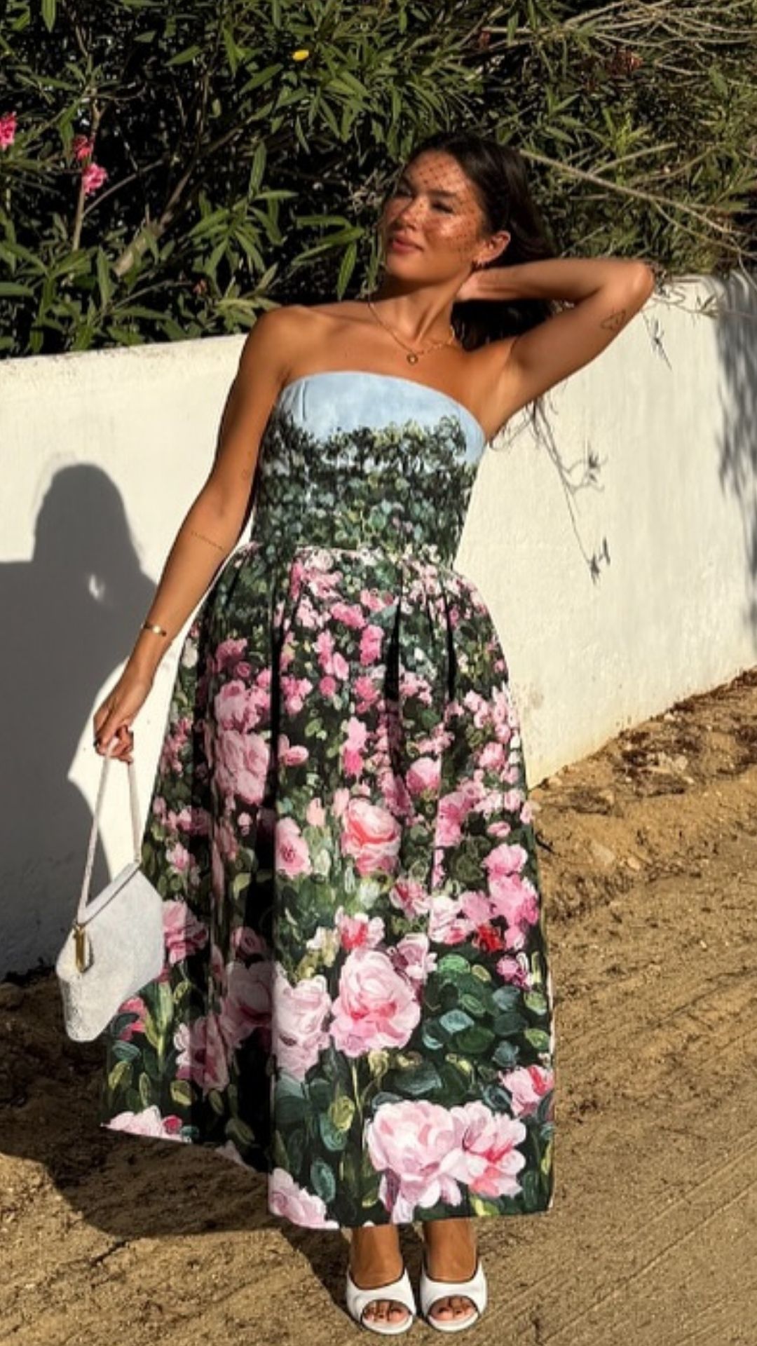 Floral Dress Outfit With a Strapless Design and Vibrant Pink Roses