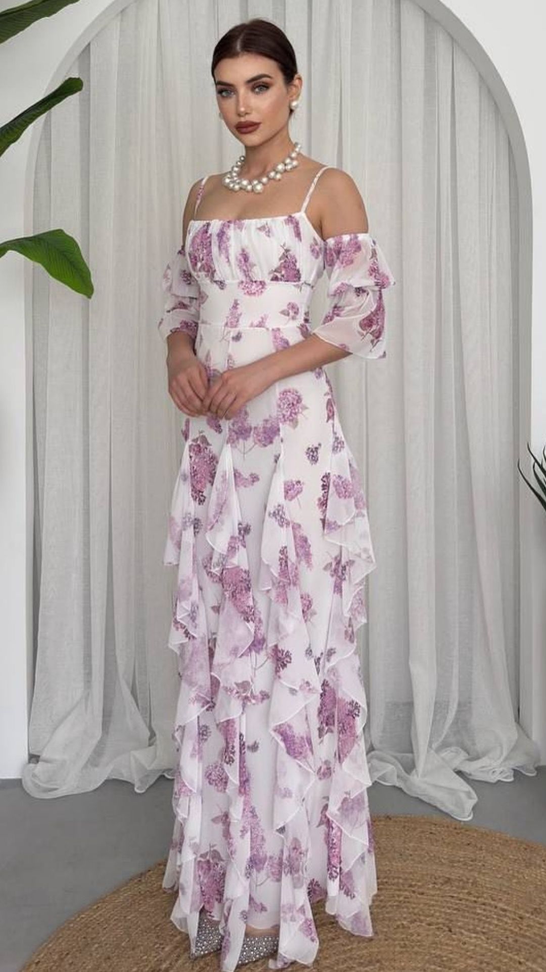The off-the-shoulder design enhances the romantic appeal, while the flowing maxi length ensures an elegant and flattering silhouette.