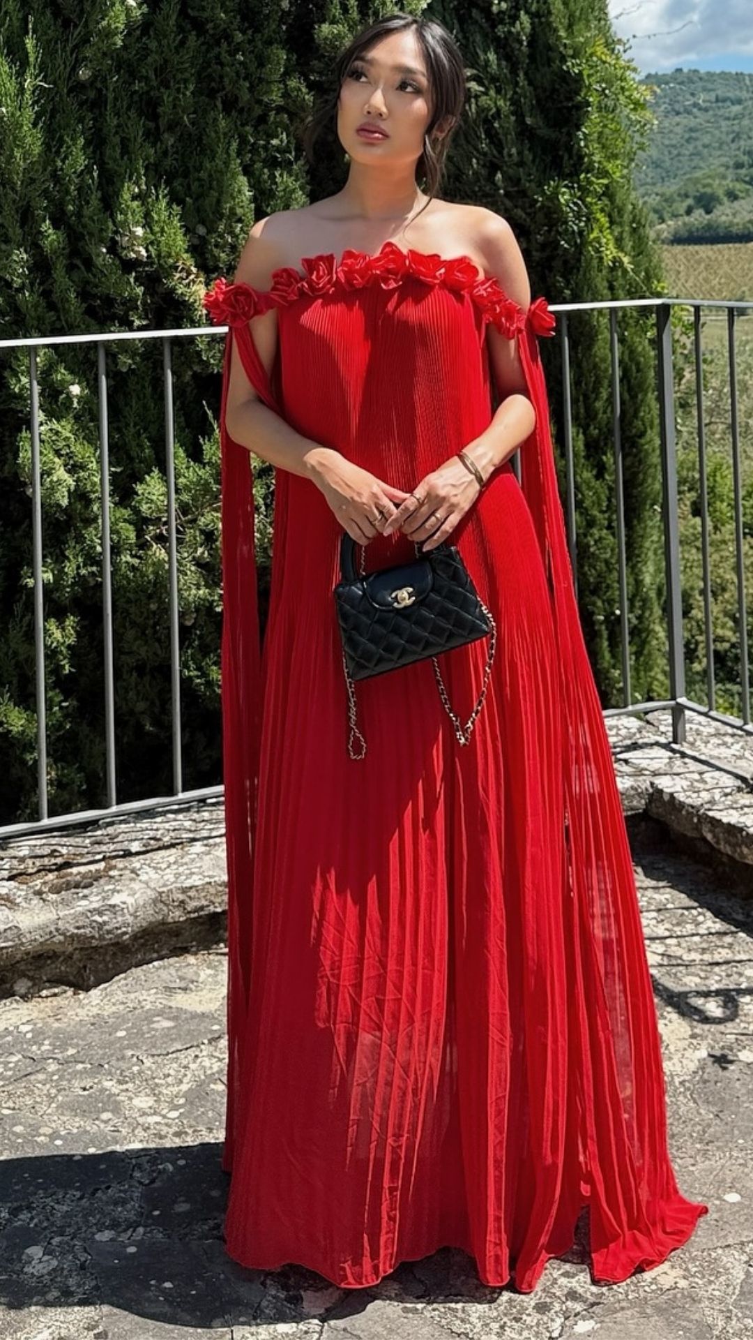 This vibrant red floral dress stands out in any setting, perfectly blending romance and elegance.
