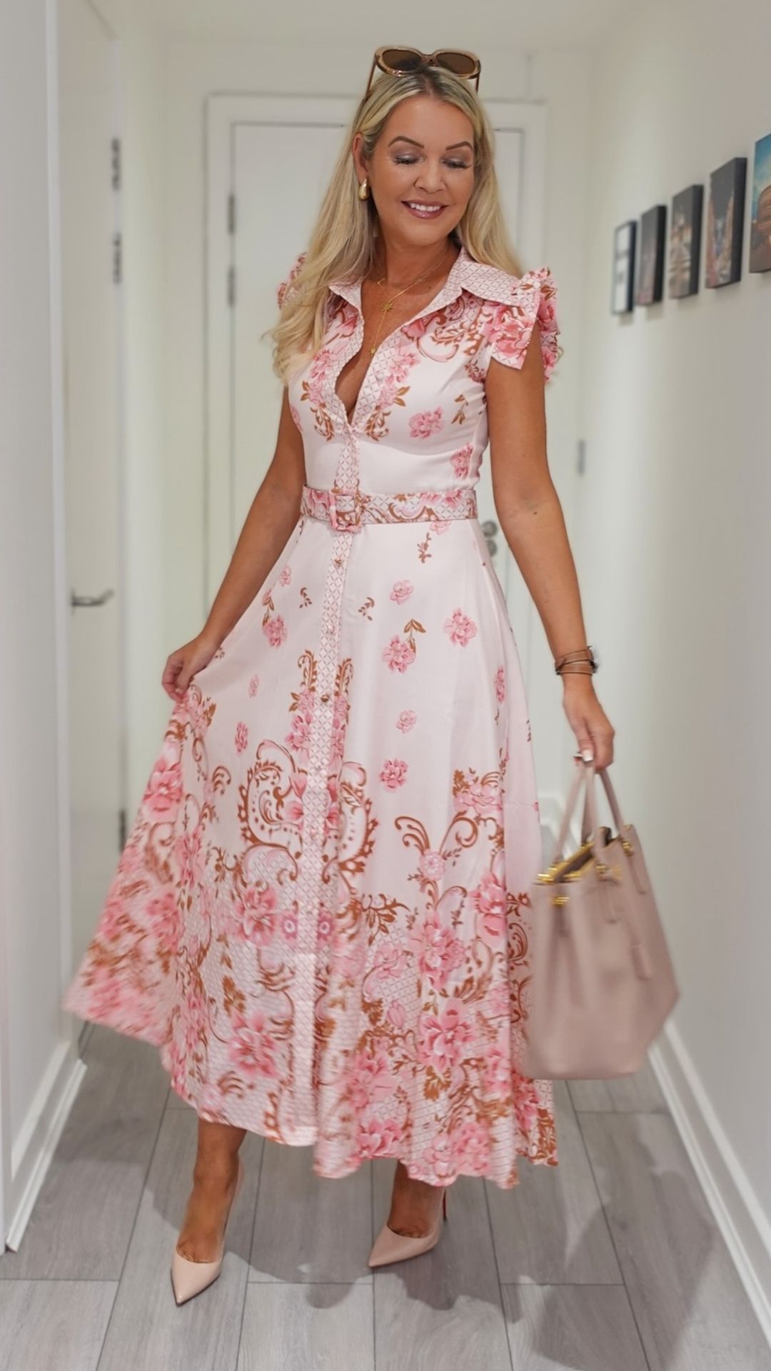 This stunning floral wedding guest dress captures the essence of elegance with its soft pink hues and intricate rose patterns.