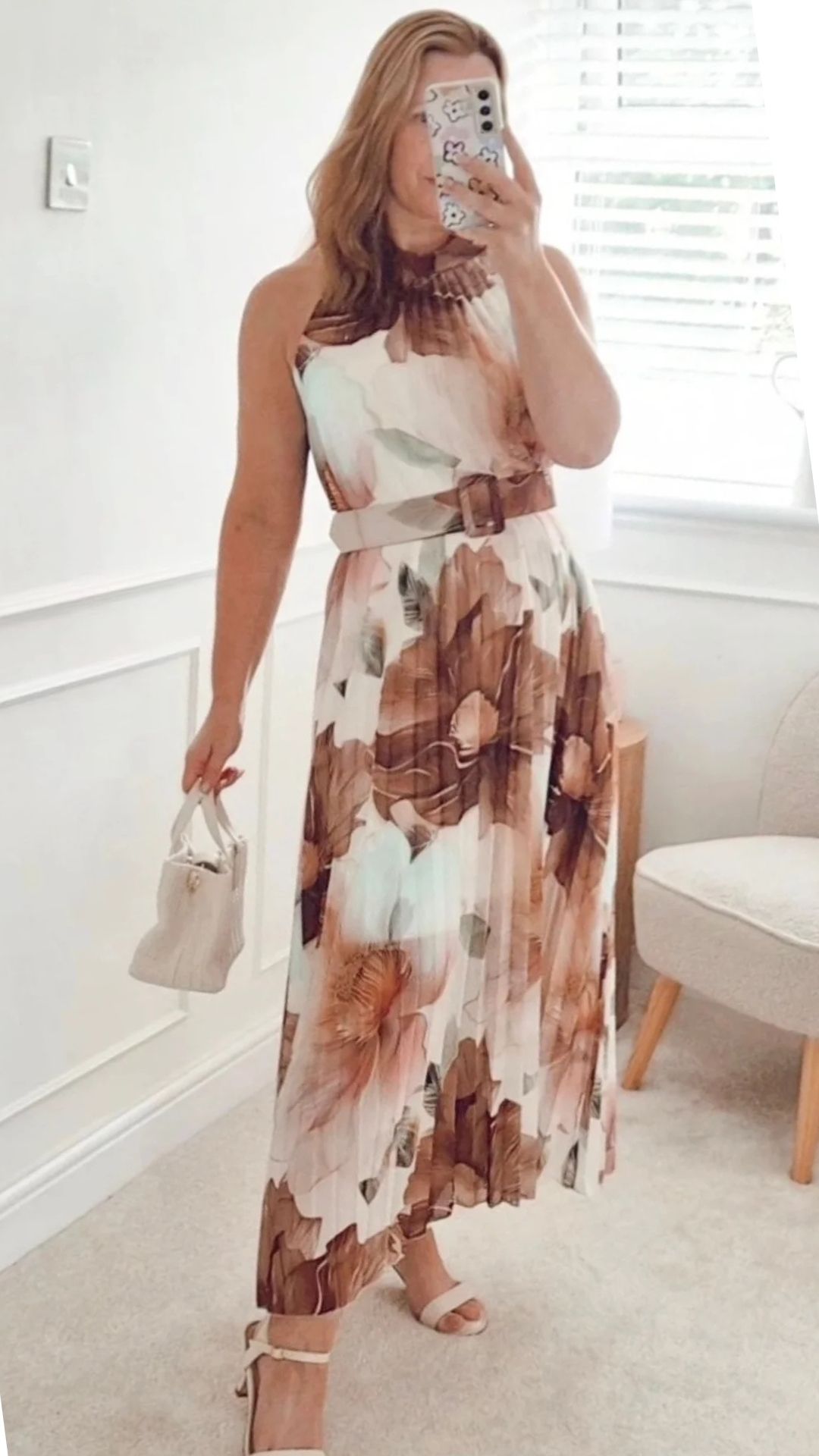 This elegant floral dress features a fitted halter neckline that beautifully emphasizes the shoulders and collarbone.