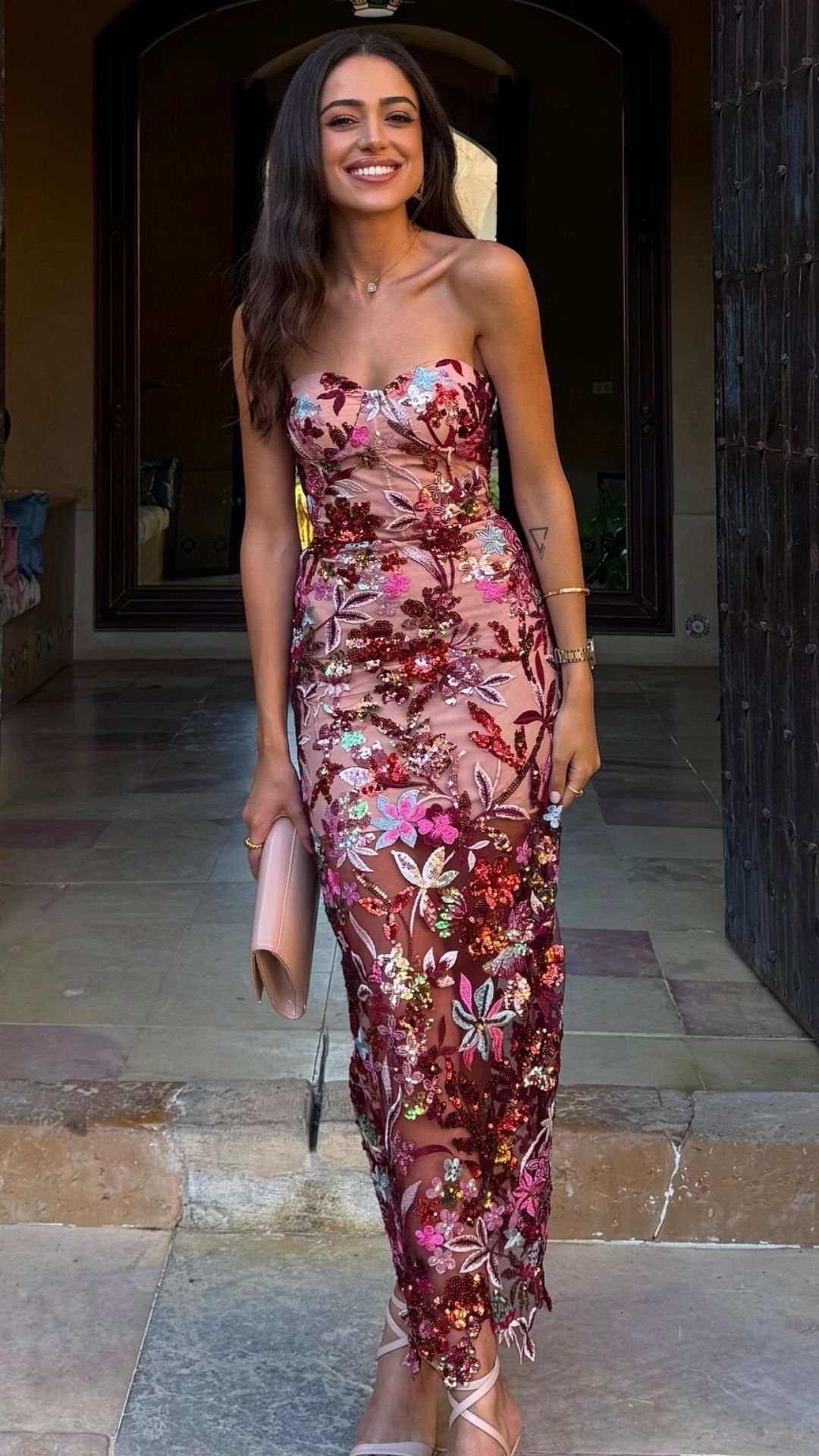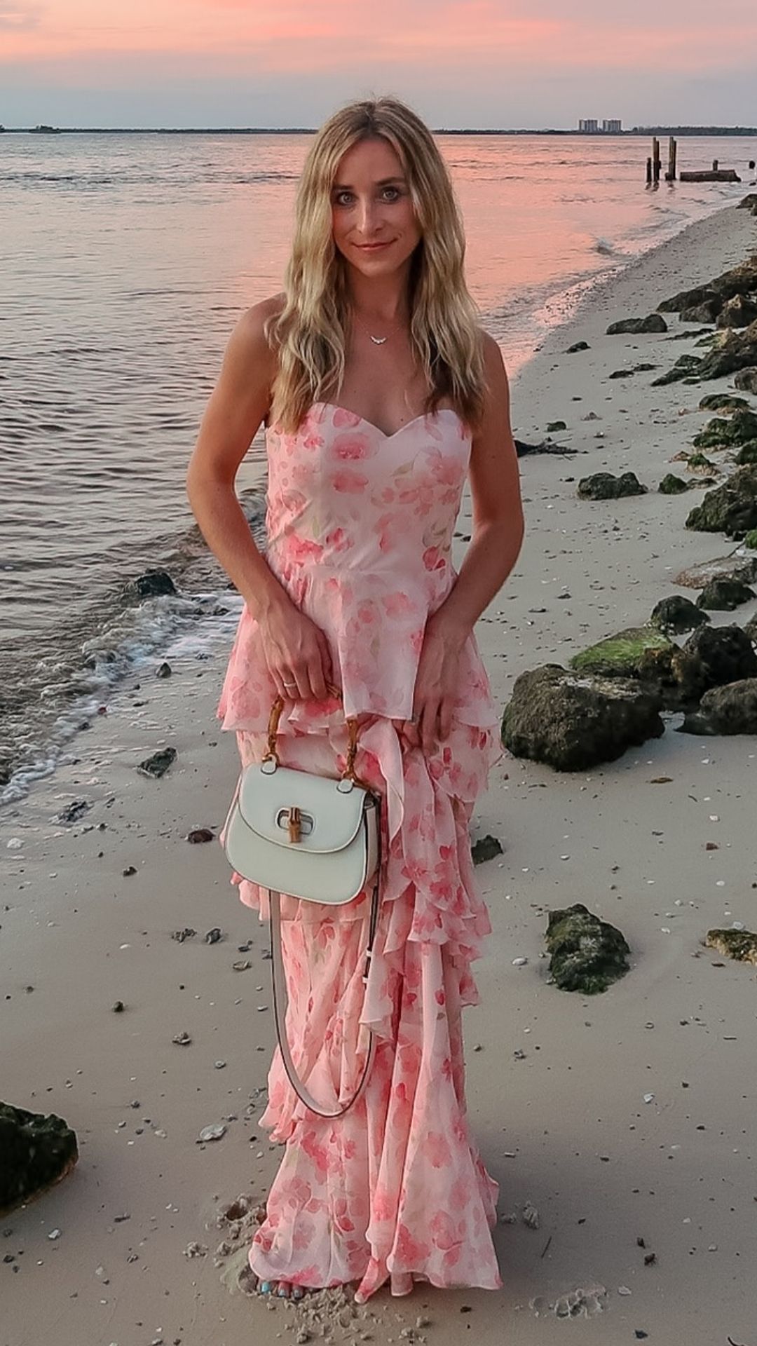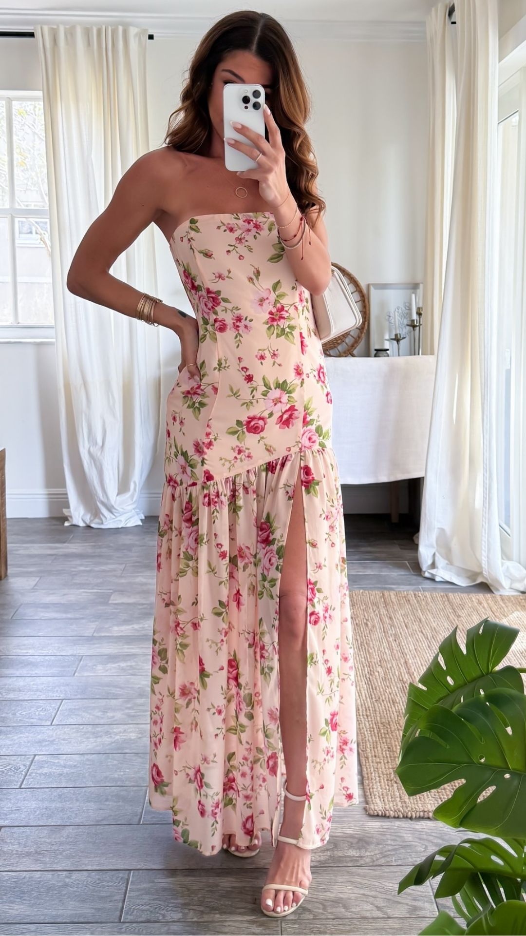 This exquisite strapless maxi gown features a soft pink base and vibrant floral patterns, making it the epitome of elegance for a wedding guest outfit.