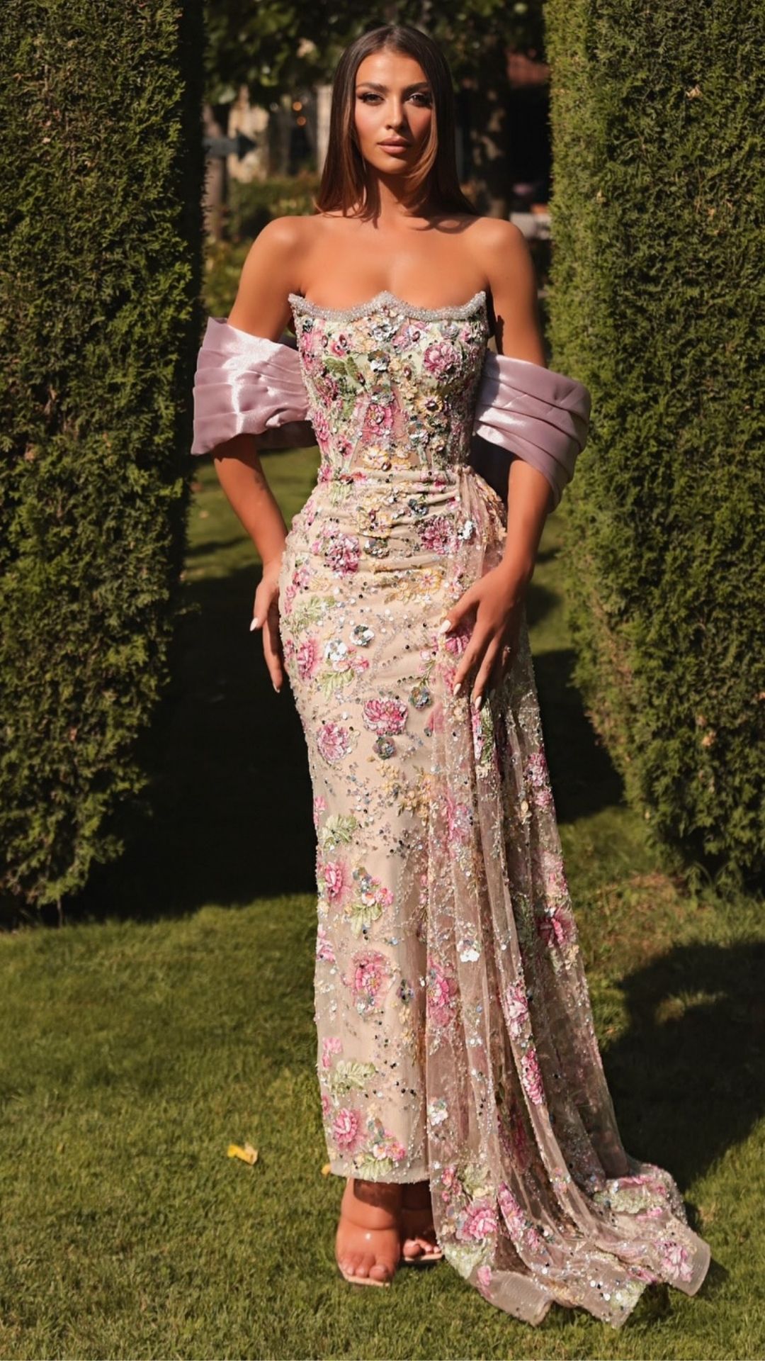 This strapless floral dress showcases exquisite embroidery in soft pastels, predominantly pinks and greens, complemented by delicate shimmering beads.