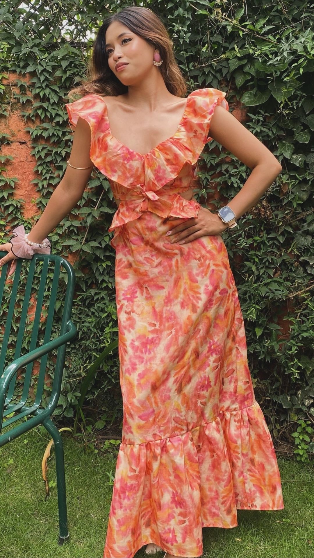 Its soft, flowing fabric drapes beautifully, while the watercolor-style floral patterns in vibrant orange and peach hues enhance its romantic vibe.