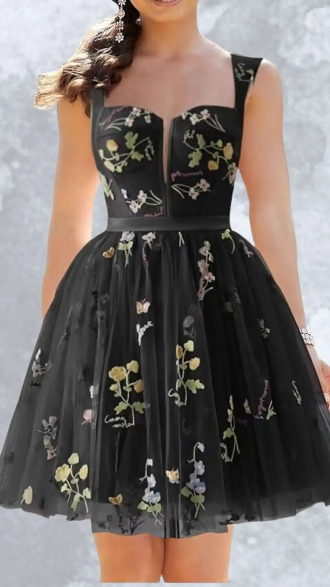 Elegant Black Tulle Homecoming Dress with Floral Embroidery