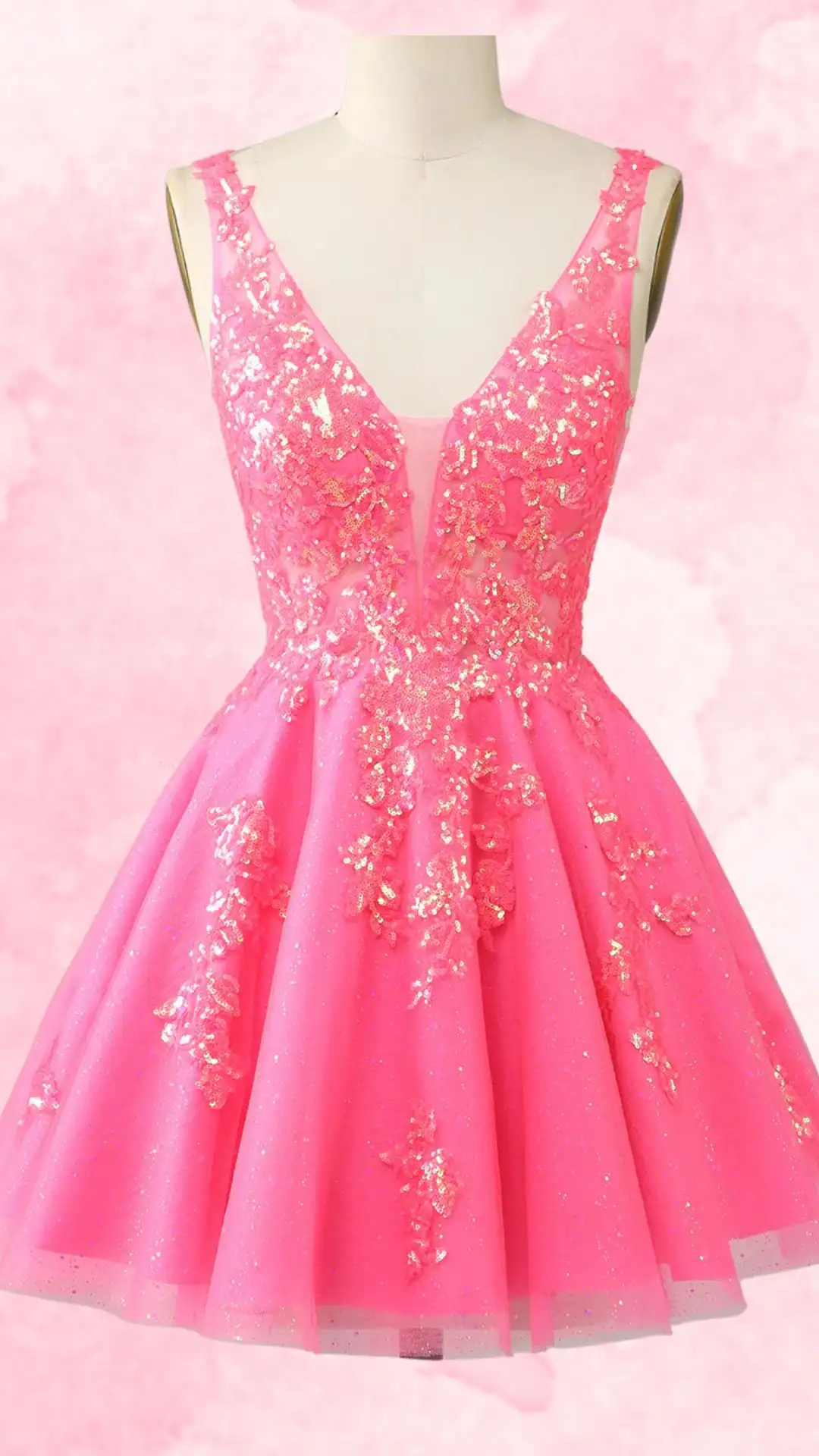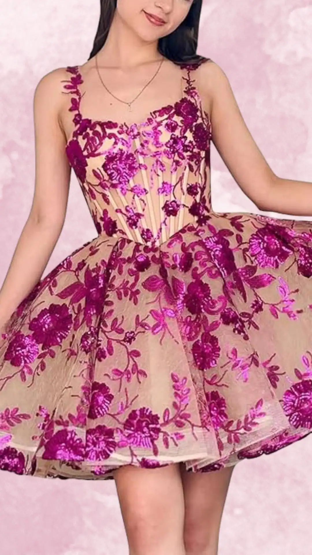 Vibrant Hot Pink Flowy Homecoming Dress with Floral Sequin Details