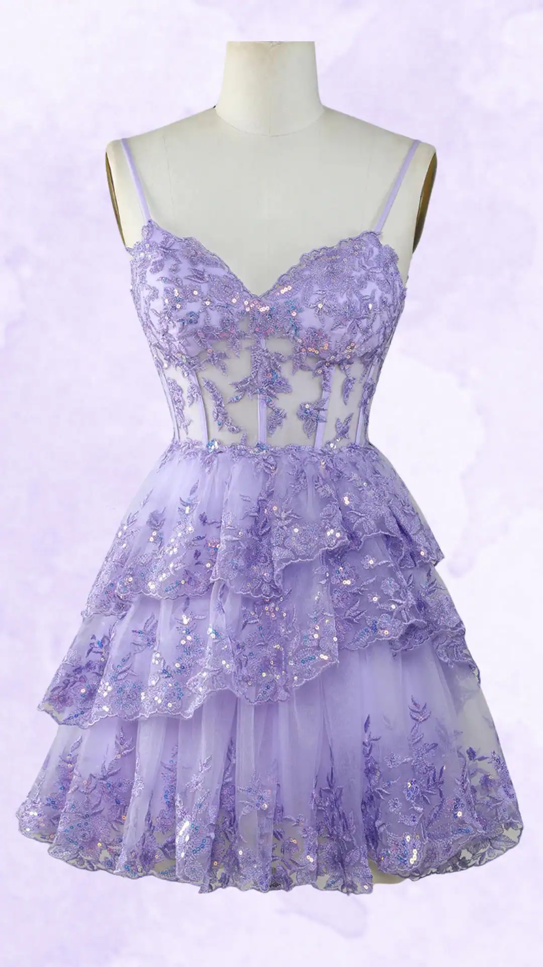 Delicate Lavender Homecoming Dress with Floral Lace and Sequins