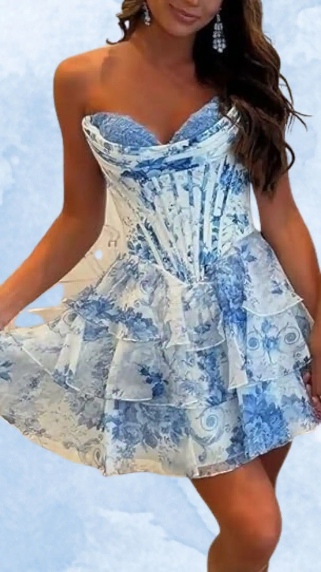 Stunning Strapless Blue Floral Homecoming Dress with Flowy Skirt