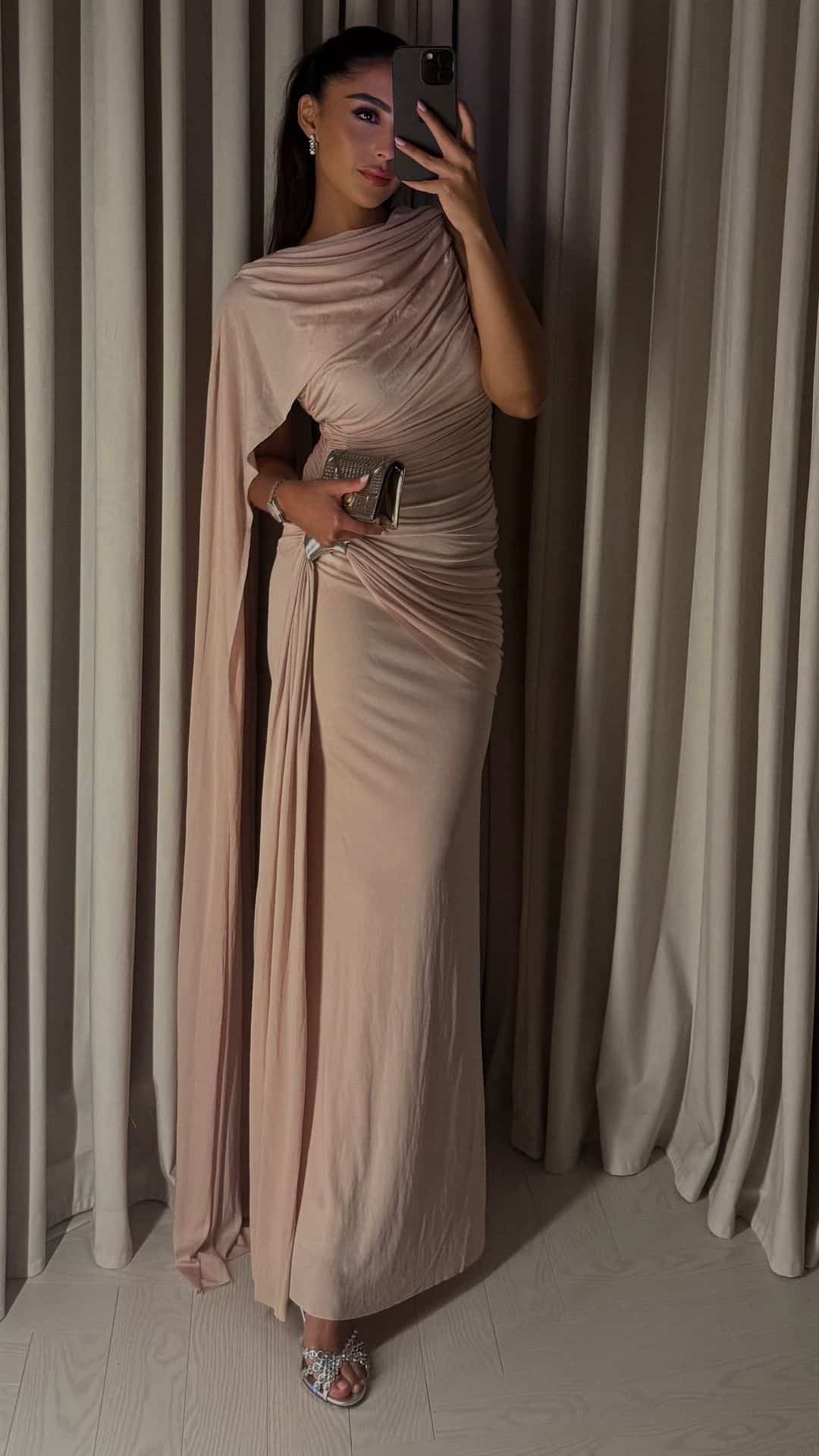 This stunning floor-length gown is the epitome of modern elegance, draping beautifully across one shoulder to reveal an alluring yet sophisticated style.