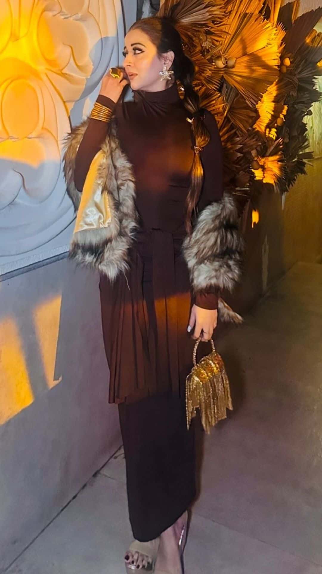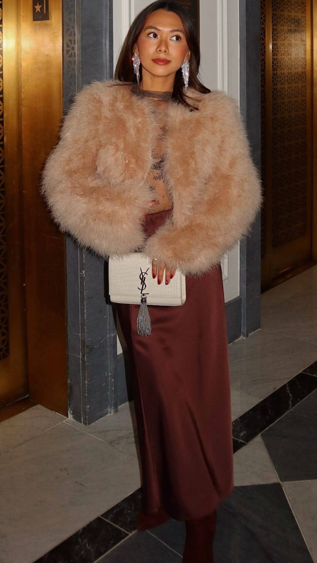 This stunning outfit combines a soft, fluffy beige faux fur jacket and a sleek, fitted chocolate brown satin dress, creating a warm and elegant look perfect for a night out.
