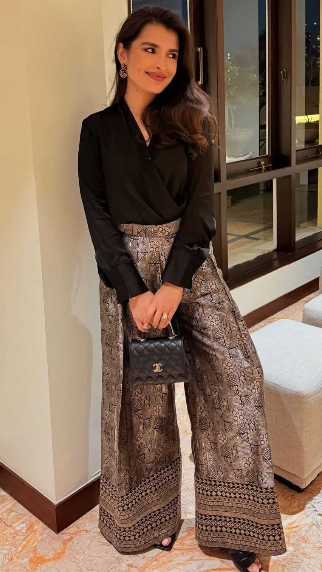 Paired with elegant wide-leg trousers featuring intricate geometric patterns, the ensemble balances timeless style with modern flair.