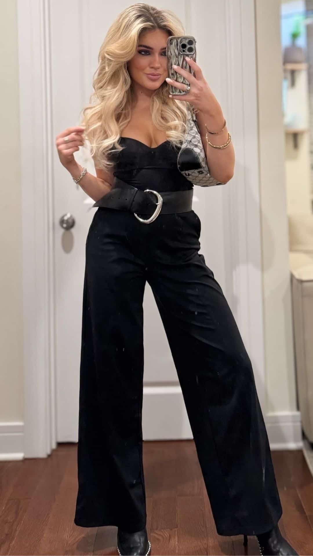 This stunning black jumpsuit is a versatile choice for any night out. Its fitted design and sweetheart neckline enhance your figure, while the wide belt cinches the waist for an hourglass shape.