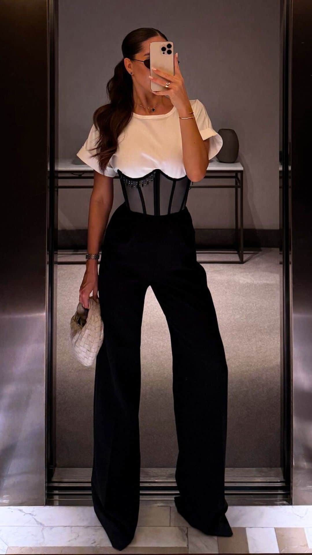 The fitted black corset makes a striking statement when layered over a loose white t-shirt, highlighting a sharp contrast between casual comfort and sophisticated elegance.