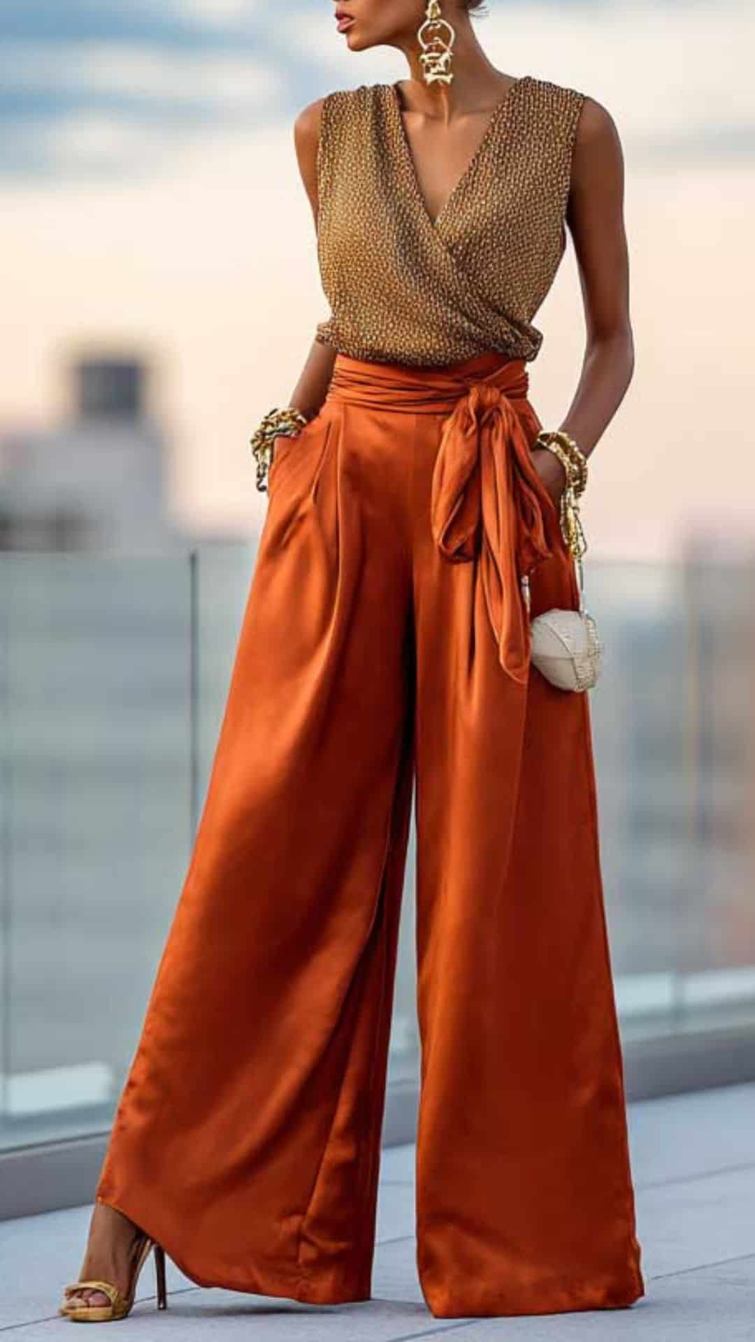 This stunning outfit features a shimmering gold-beaded wrap top that drapes elegantly, paired with high-waisted, wide-leg trousers in a rich burnt orange, creating a striking contrast.