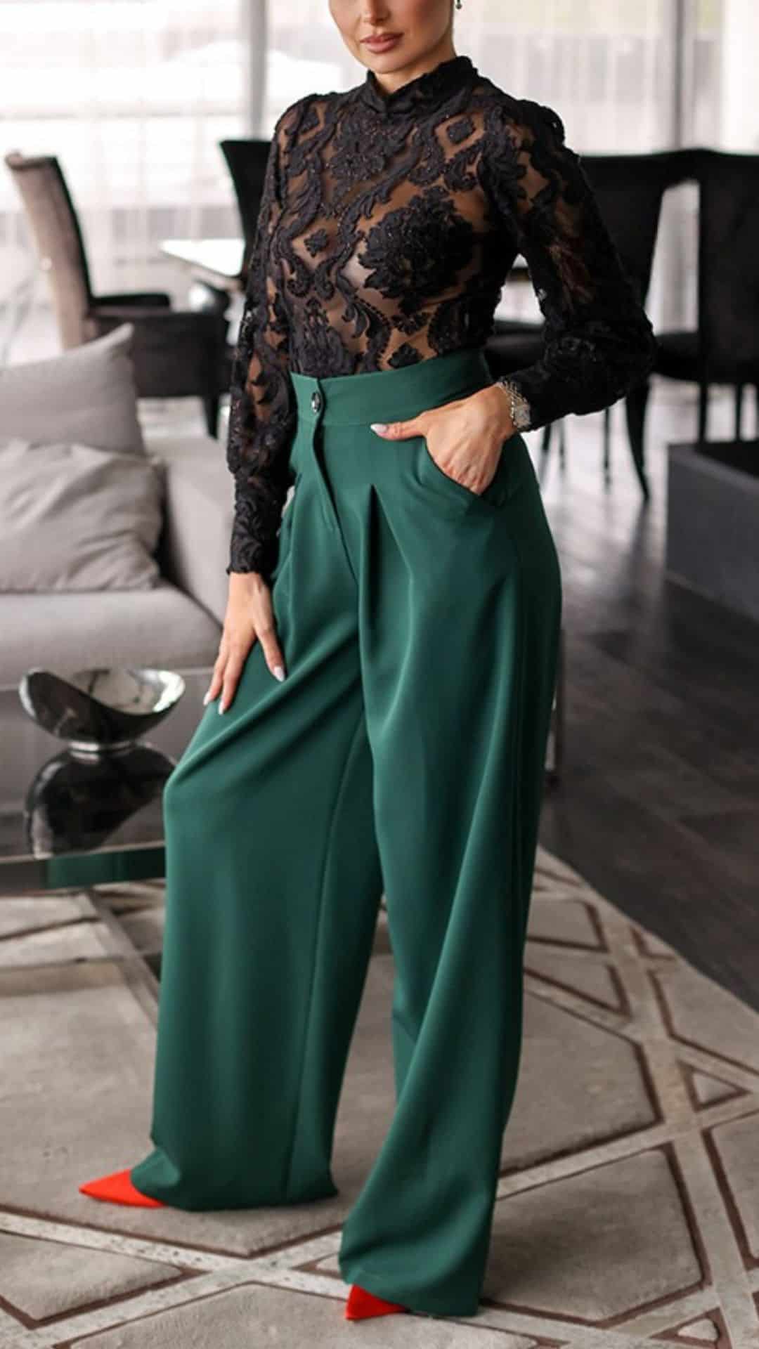 Paired with high-waisted, wide-leg emerald green trousers, the ensemble achieves a stunning contrast that flatters the silhouette.