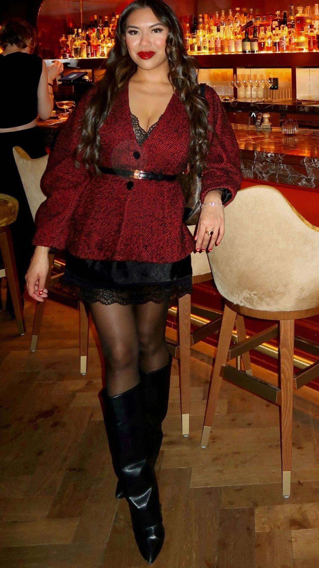 Going Out Outfit With Stylish Red and Black Tweed Oversized Blazer