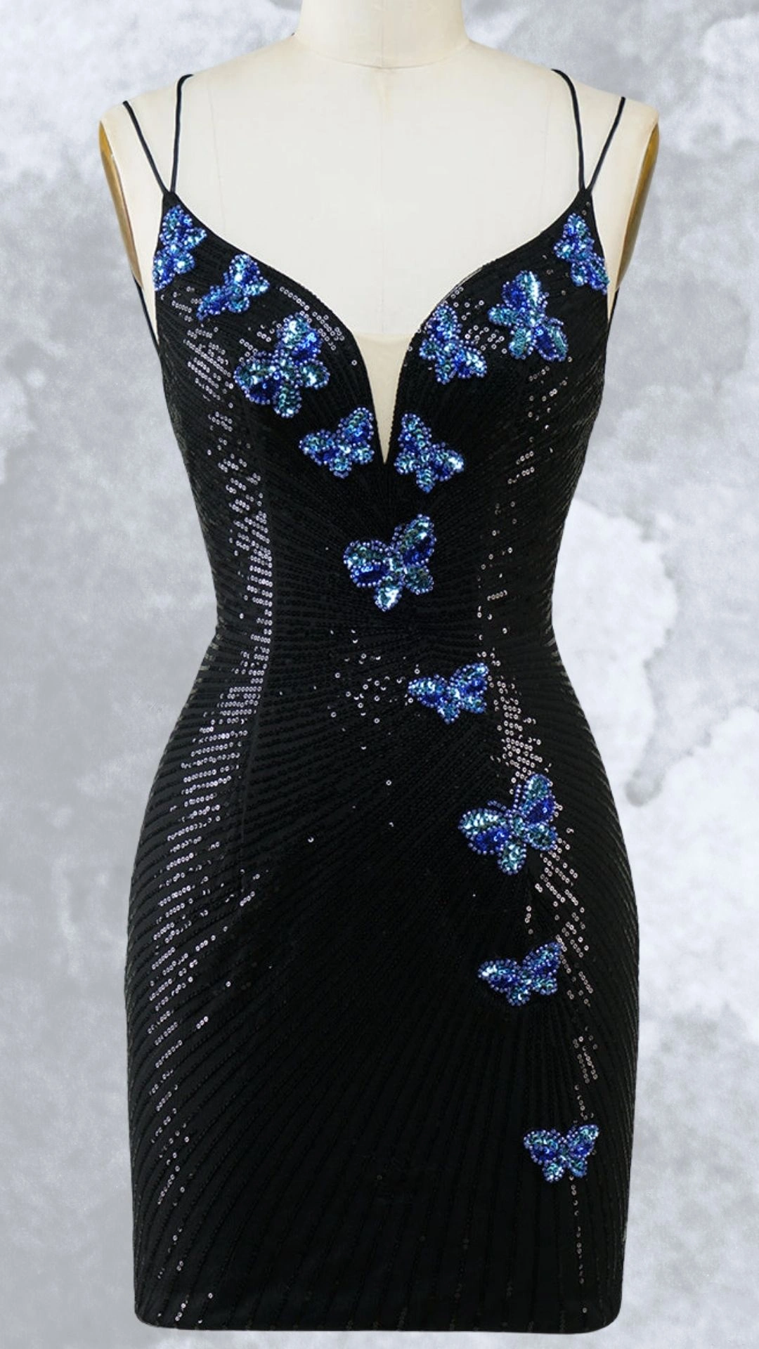 The intricate blue butterfly sequins provide a mesmerizing visual contrast against the sleek black background, making this dress a standout piece for any special occasion.