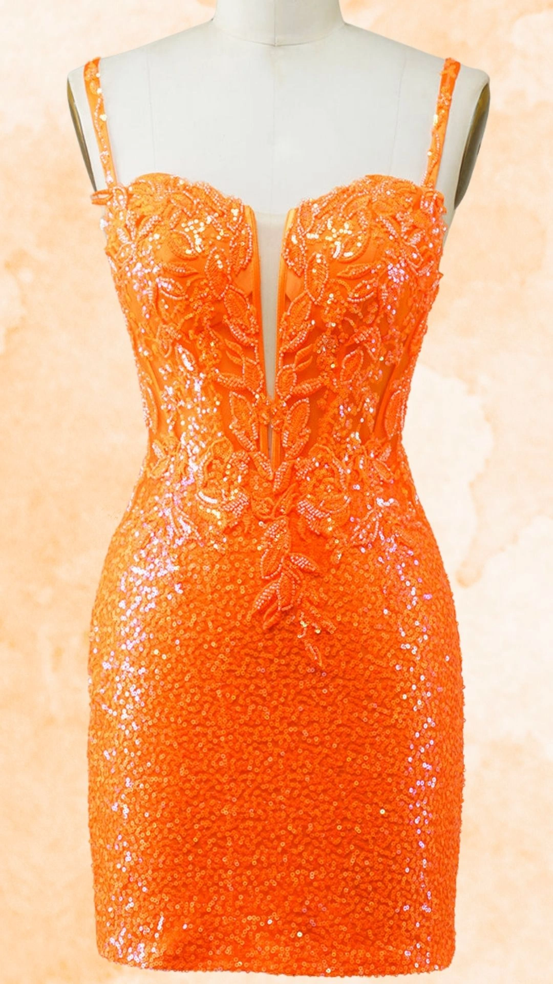 This vibrant orange homecoming dress commands attention with its dynamic sequin-covered fabric that catches and reflects light with every movement.