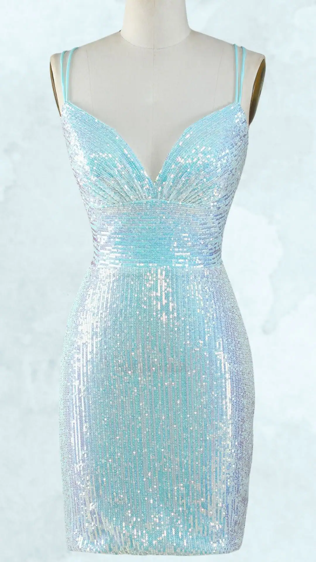 This exquisite homecoming dress transforms a classic silhouette into a show-stopping statement piece with its shimmering blue sequin fabric that catches light from every angle.