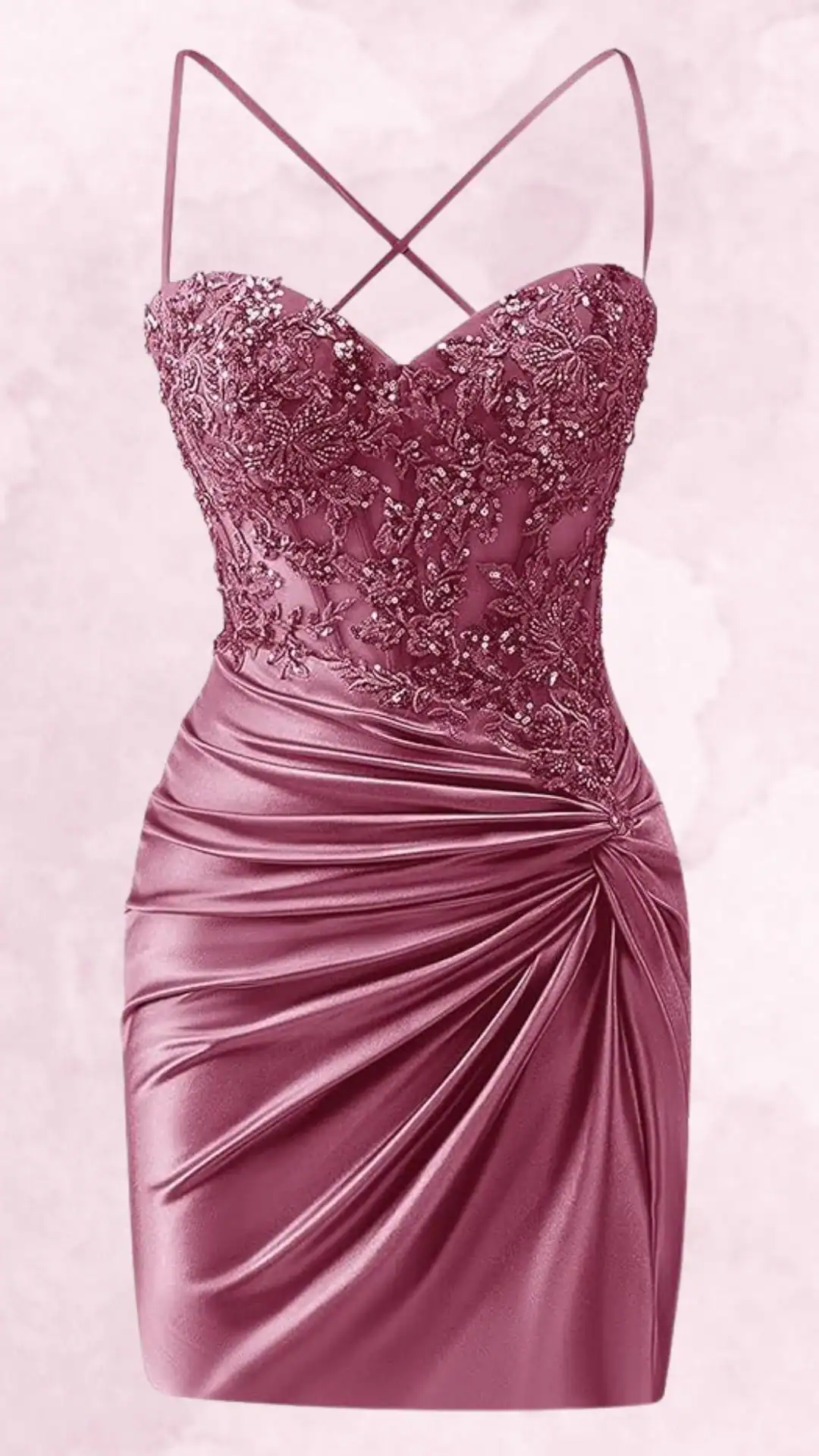 Delicate crisscross spaghetti straps add a touch of refined femininity while ensuring a secure and comfortable fit for a night of dancing and celebration.
