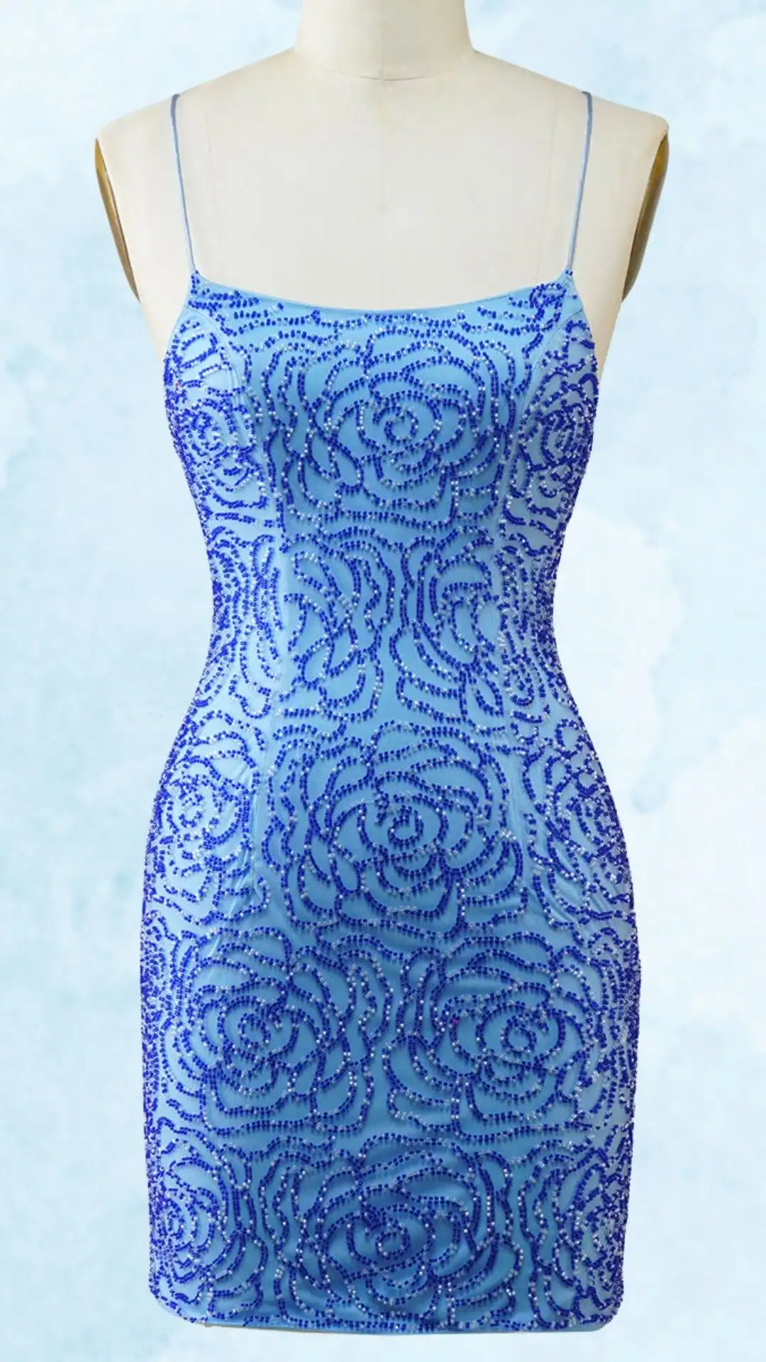 This light blue homecoming dress embodies elegant sophistication with its form-fitting silhouette and intricate beadwork.