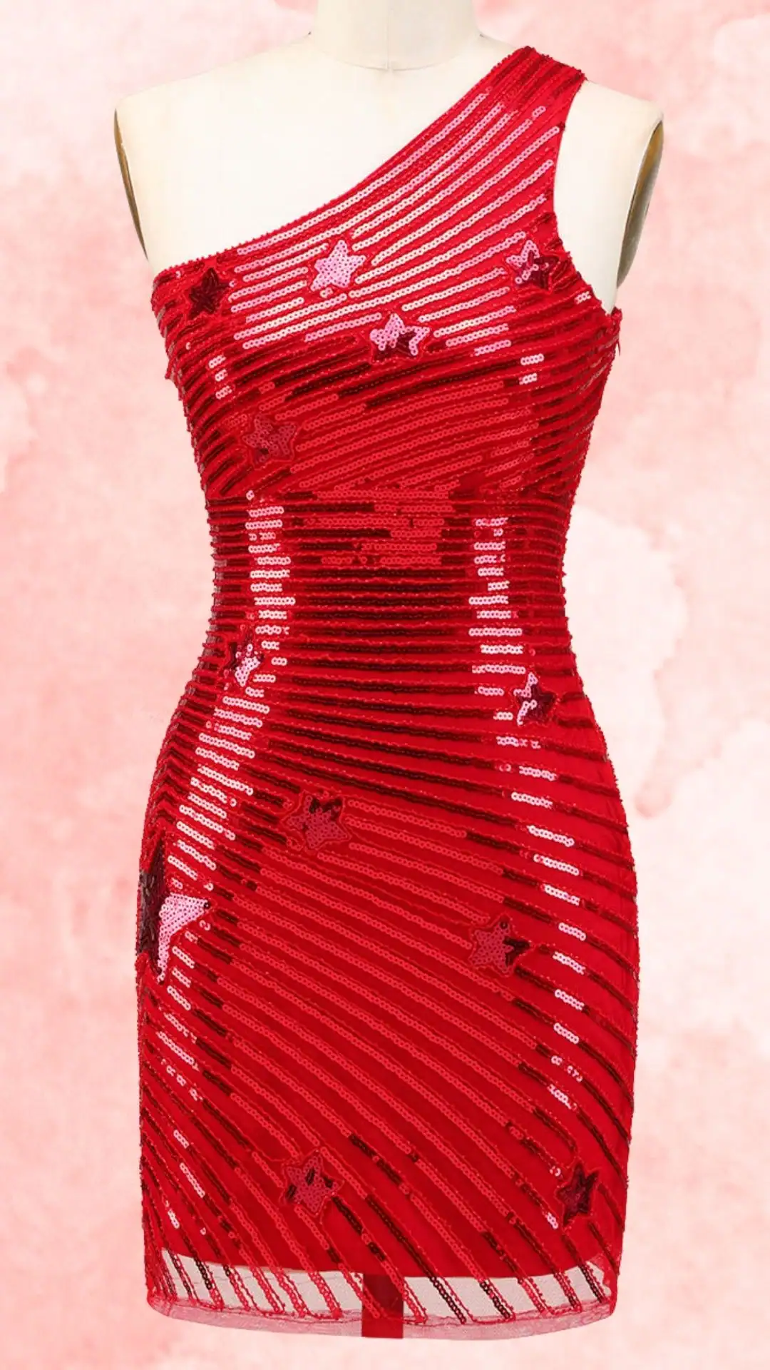 Red Hot Sequin Star: One-Shoulder Glamour for Your Perfect Homecoming Look