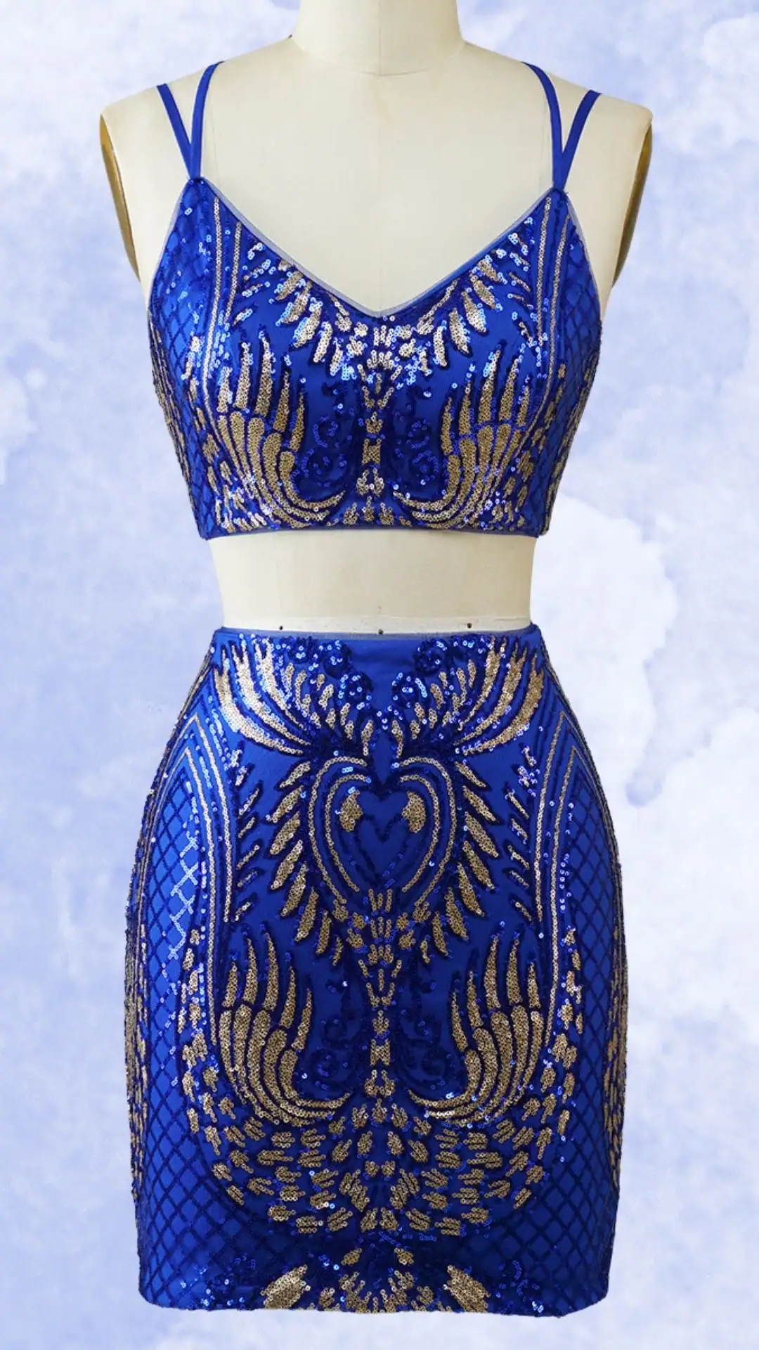 Royal Blue & Gold Sequin Bodycon Homecoming Two Piece Dress