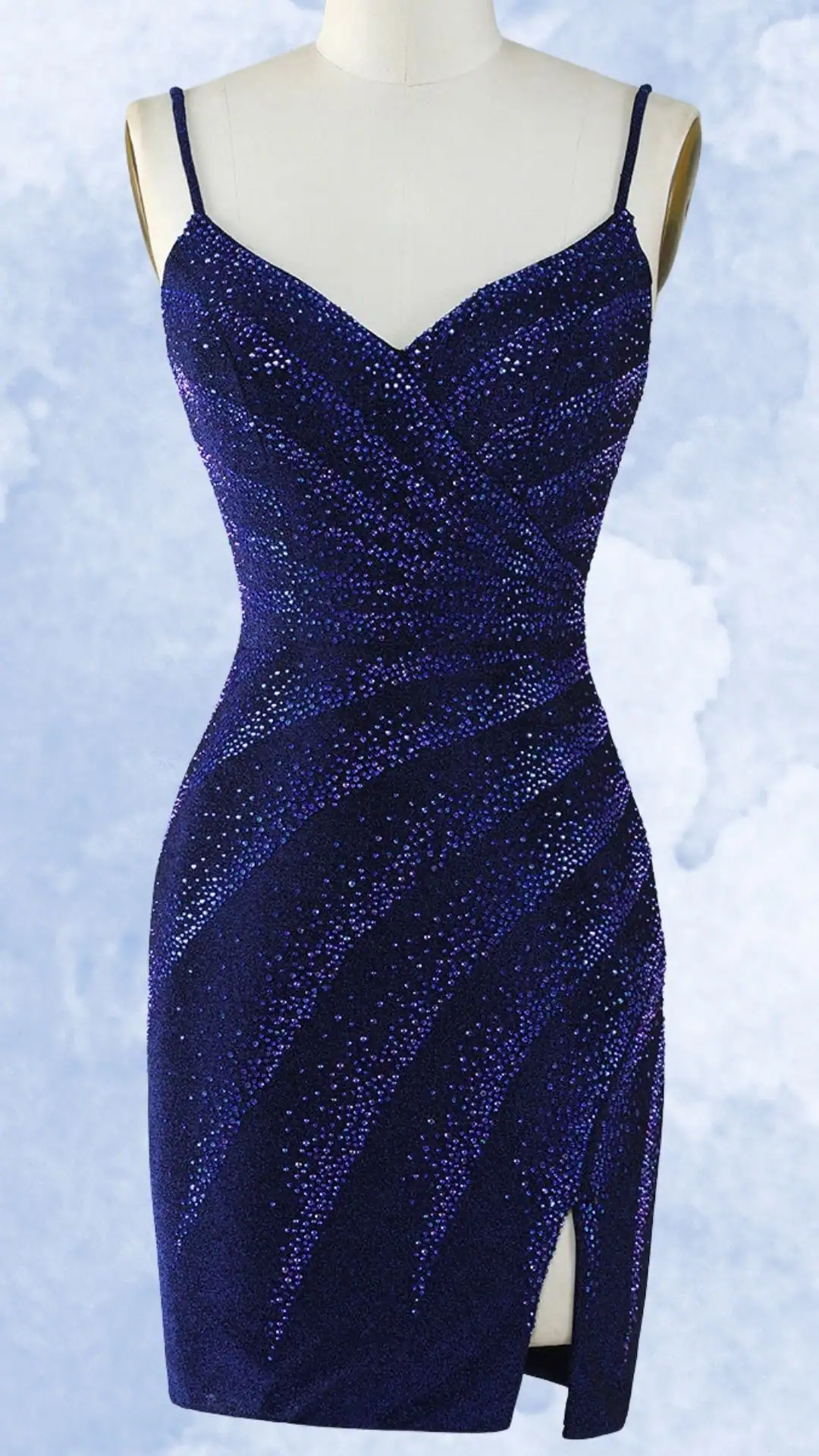 This royal blue homecoming dress delivers jaw-dropping glamour with its strategic sequin placement and form-fitting silhouette.