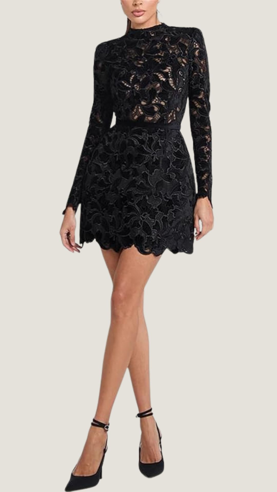 The long sleeves not only provide graceful coverage but also contrast beautifully with the daring mini length, creating a balanced and poised look.