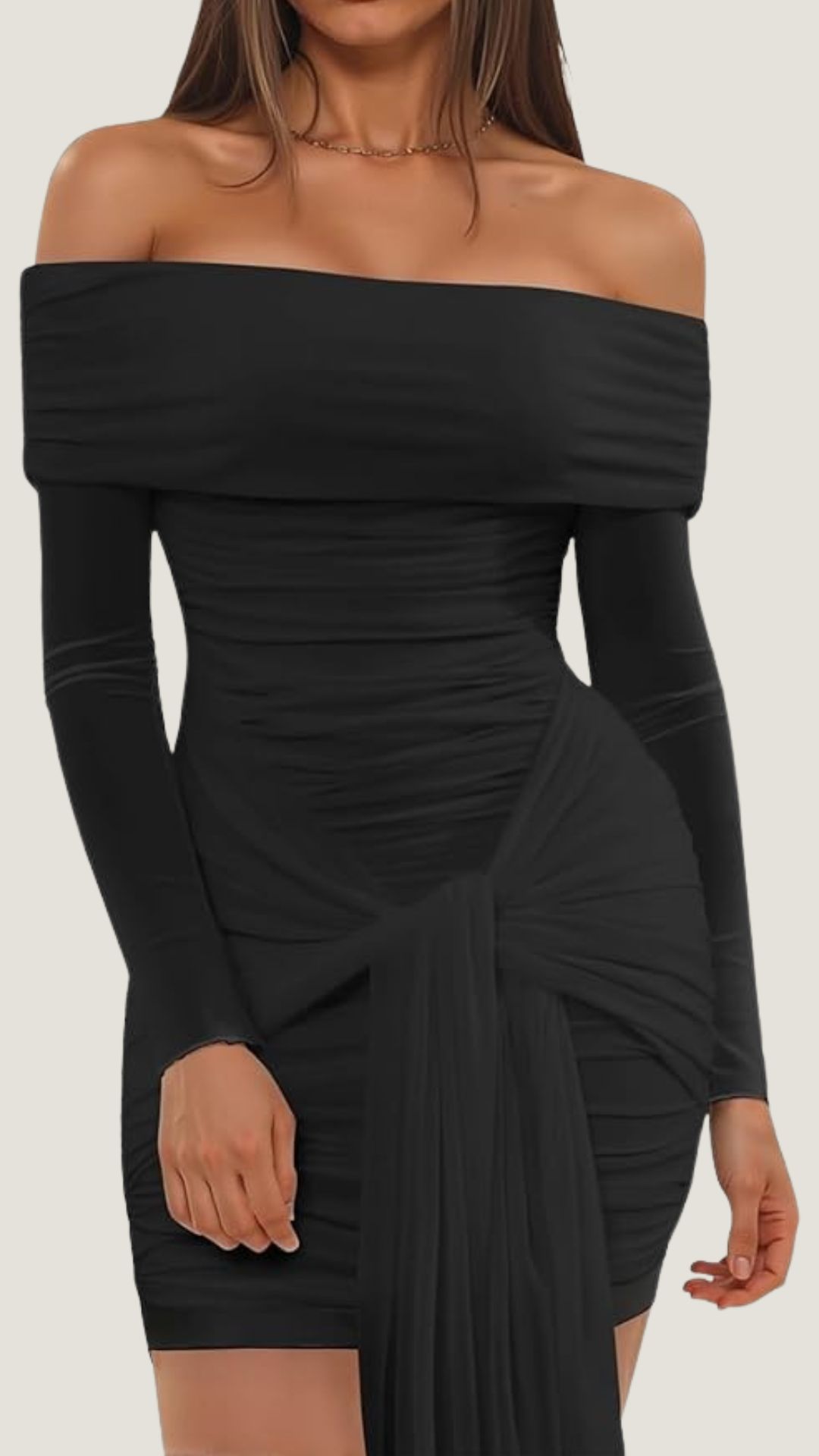 This fitted black mini dress combines elegance and style with its off-the-shoulder neckline and long sleeves.