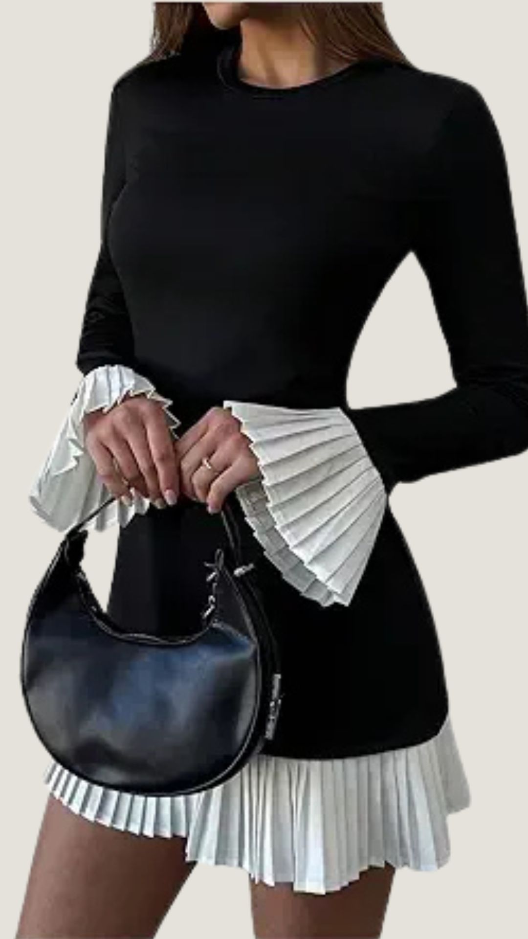 This long-sleeve black mini dress exudes elegance with its unique white pleated details adorning the cuffs and hem.