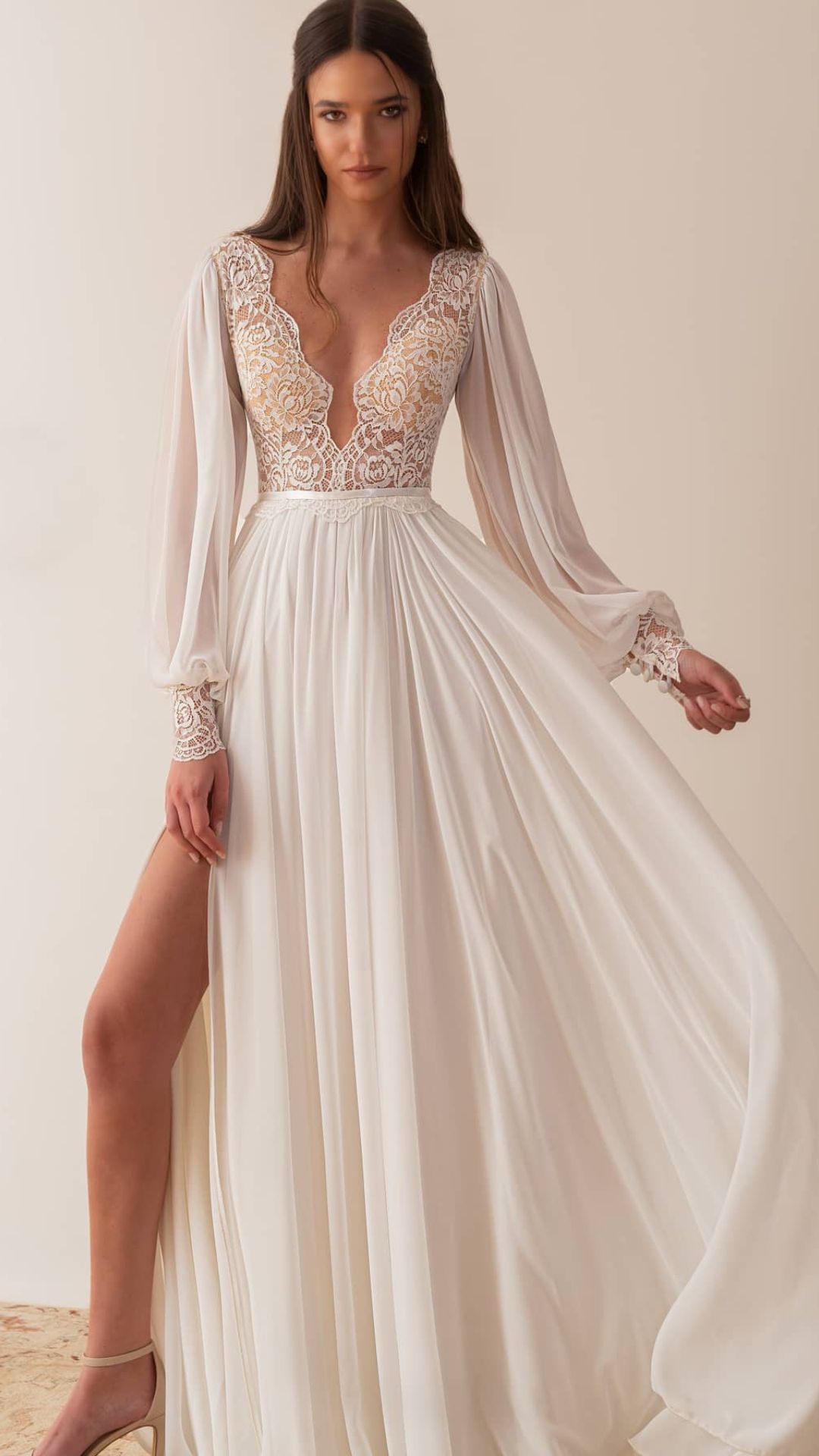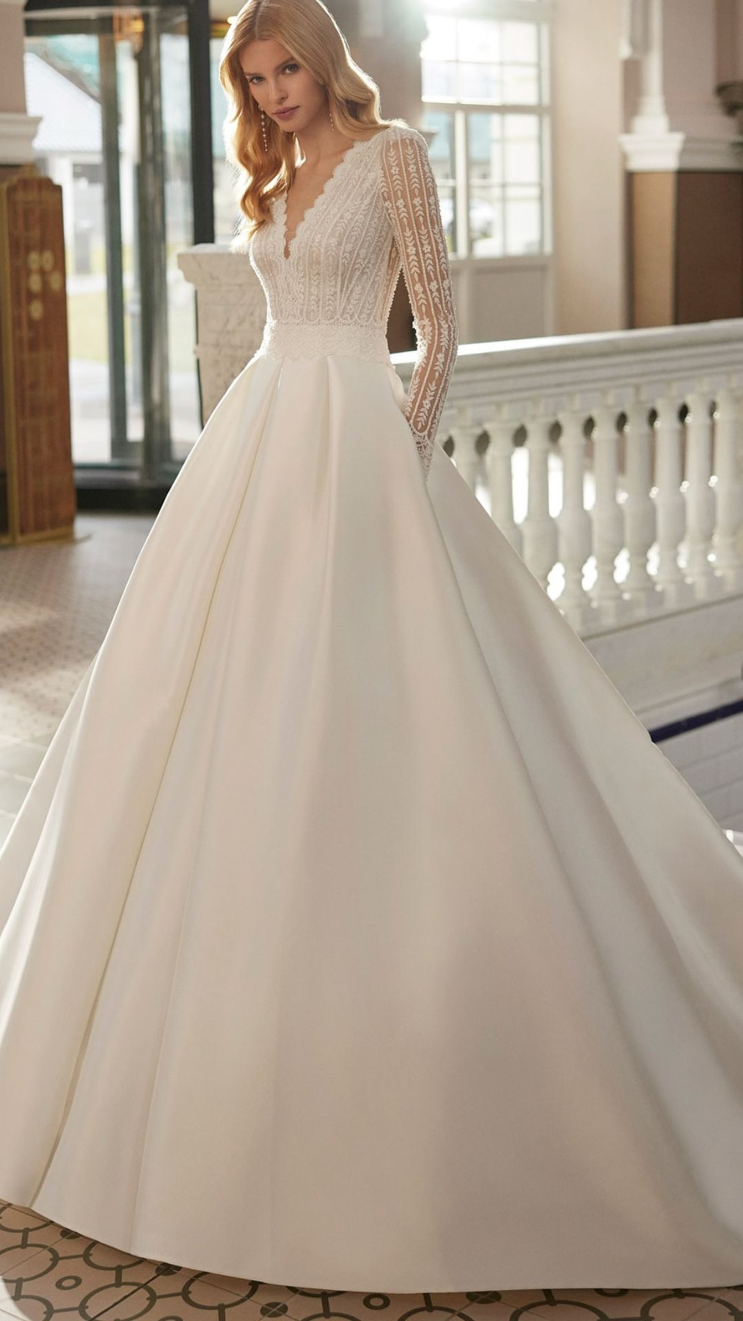Ideal for sophisticated brides, this design combines timeless elements with contemporary details. The long sleeves are perfect for a fall or winter wedding, providing coverage while maintaining a romantic vibe.