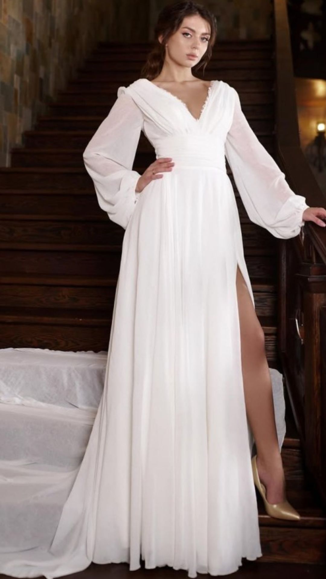 This elegant long sleeve wedding dress showcases a soft, airy white fabric that exudes romance and sophistication.