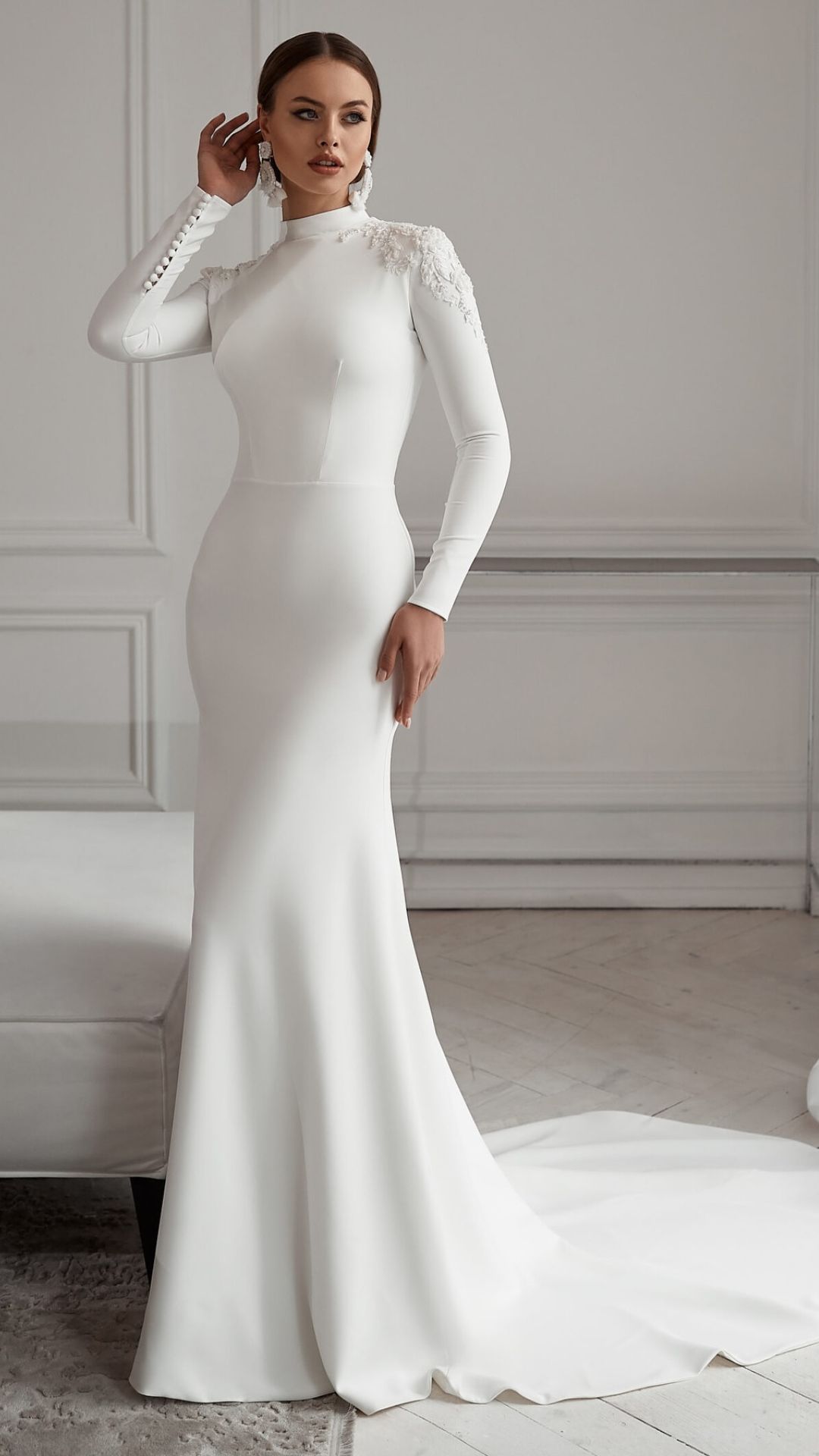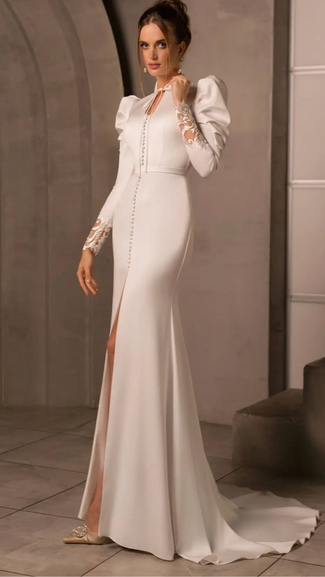 This elegant long sleeve wedding dress showcases a fitted silhouette that elegantly hugs the body. The smooth, luxurious fabric in a soft white hue complements a variety of bridal aesthetics.