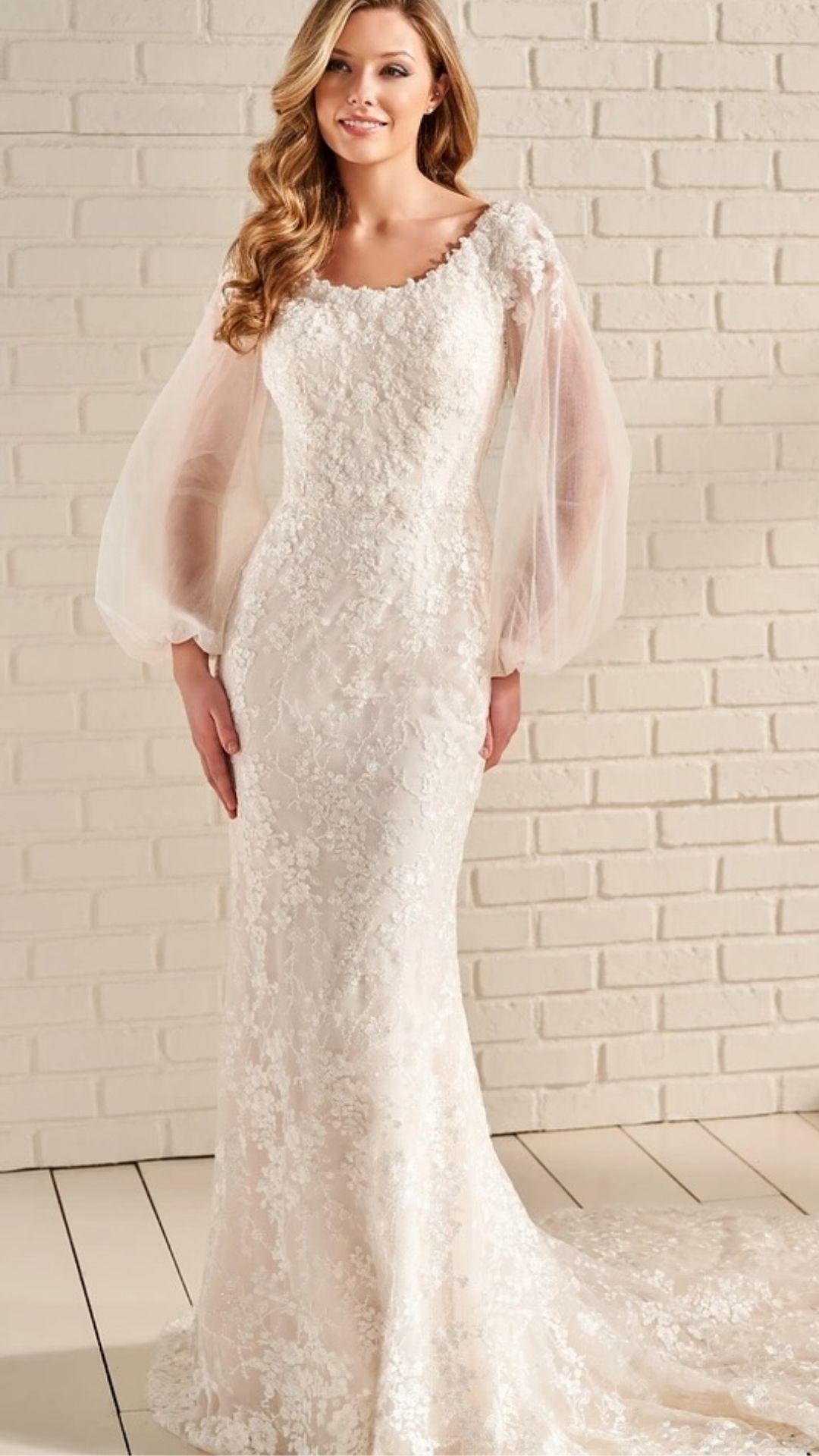 This stunning long sleeve wedding dress features sheer puffed sleeves that deliver both romance and elegance.