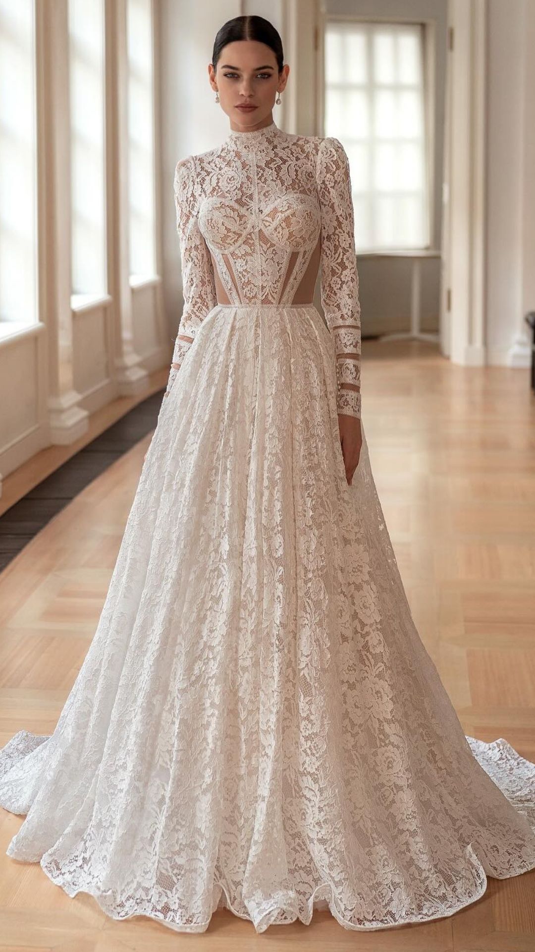 The high neck design adds sophistication, while the delicate lace extends to the wrist, providing a refined, graceful silhouette.