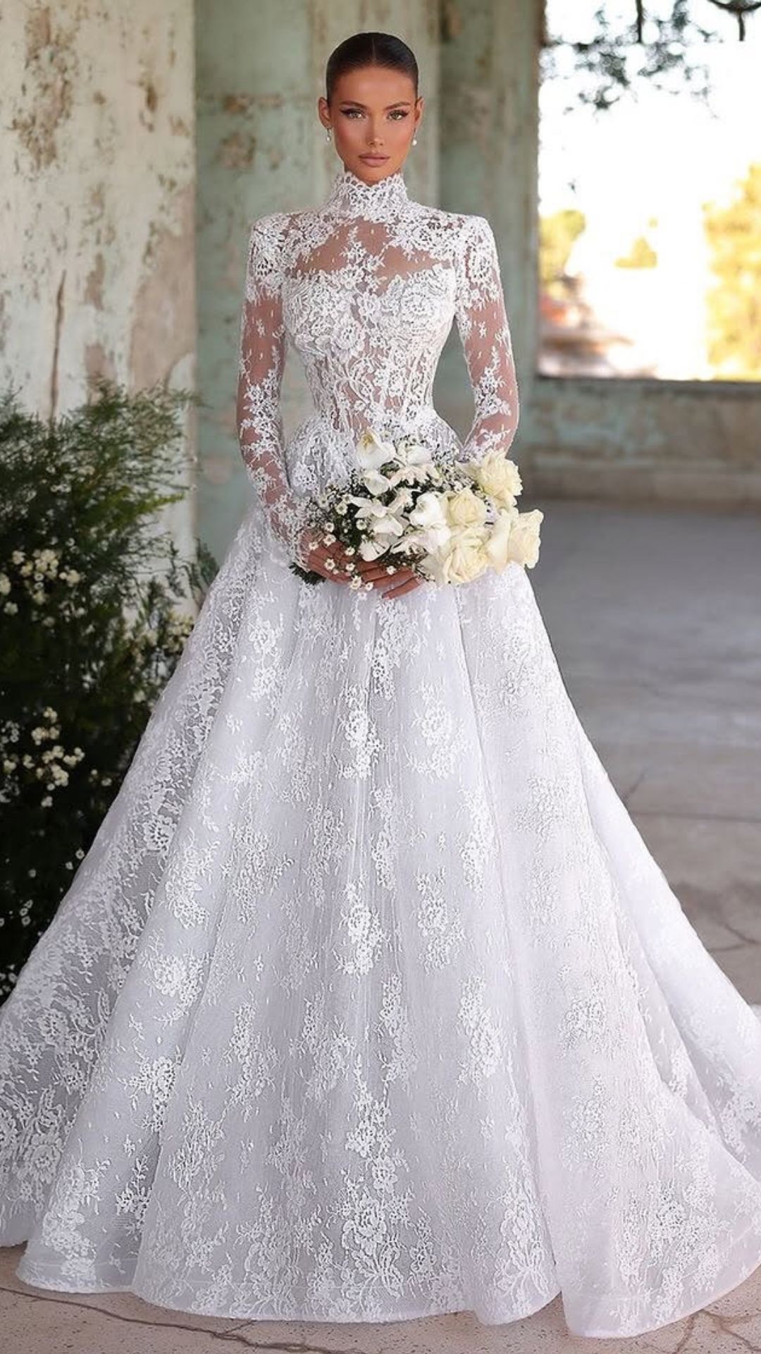 This exquisite long sleeve wedding dress features enchanting white lace, showcasing intricate floral patterns that embody romance and sophistication.