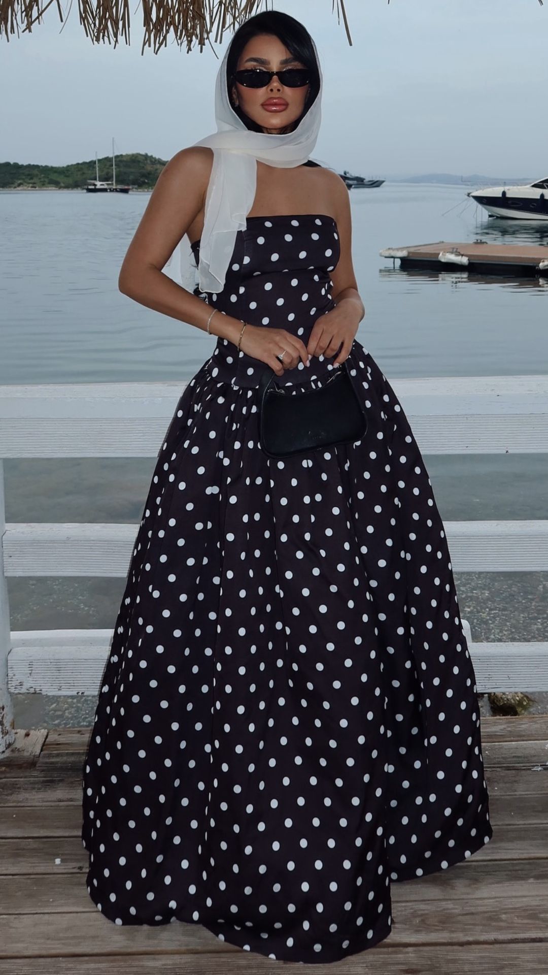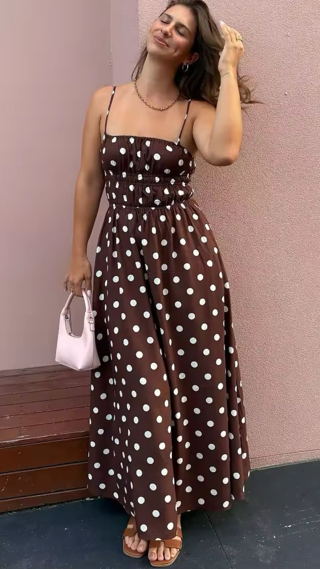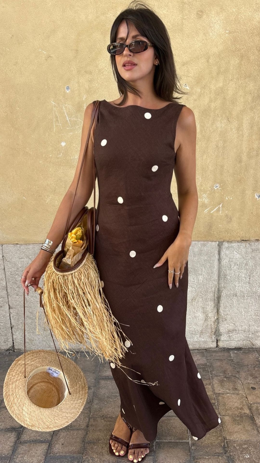 The brown sleeveless polka dot dress, featuring large white dots, is an eye-catching piece perfect for a night out. Its floor-length design adds an elegant touch, while the light fabric ensures comfort without compromising on style.
