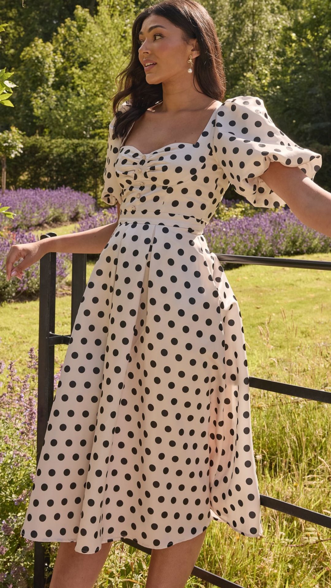 The large black dots on soft beige fabric create a striking contrast that’s both playful and elegant. The fitted bodice and square neckline accentuate the shoulders, while the flared skirt adds a touch of fun and movement.