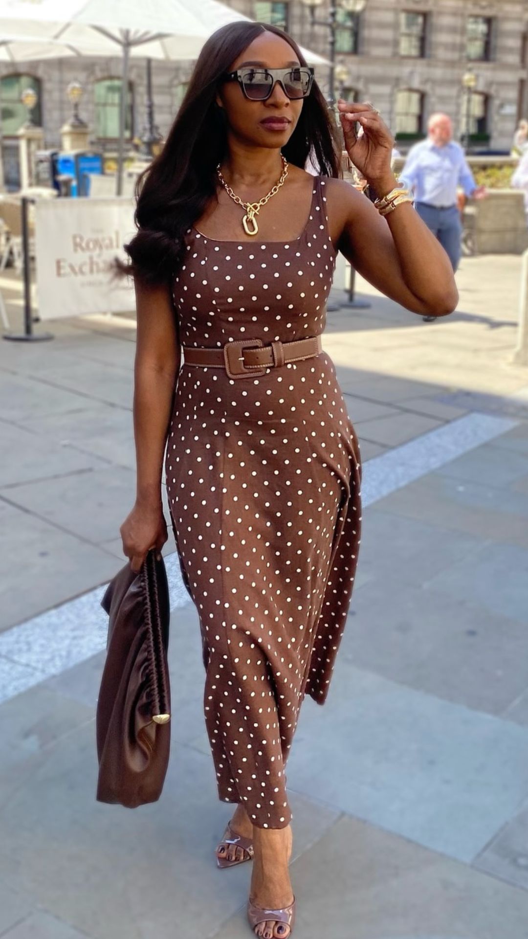 This chic brown polka dot dress, adorned with striking white dots, effortlessly blends elegance and comfort.
