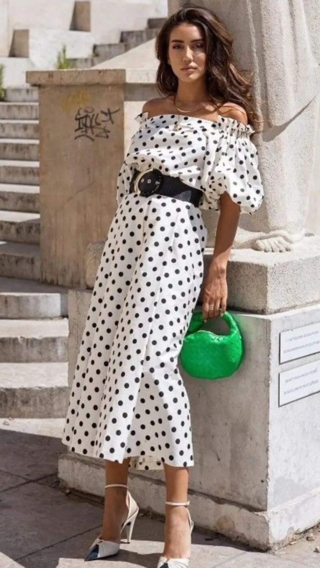 Large black dots on a white background add a timeless charm, while the wide black belt accentuates the waist, offering a flattering fit. Pairing it with a vibrant green handbag and pointed-toe heels elevates the entire look.