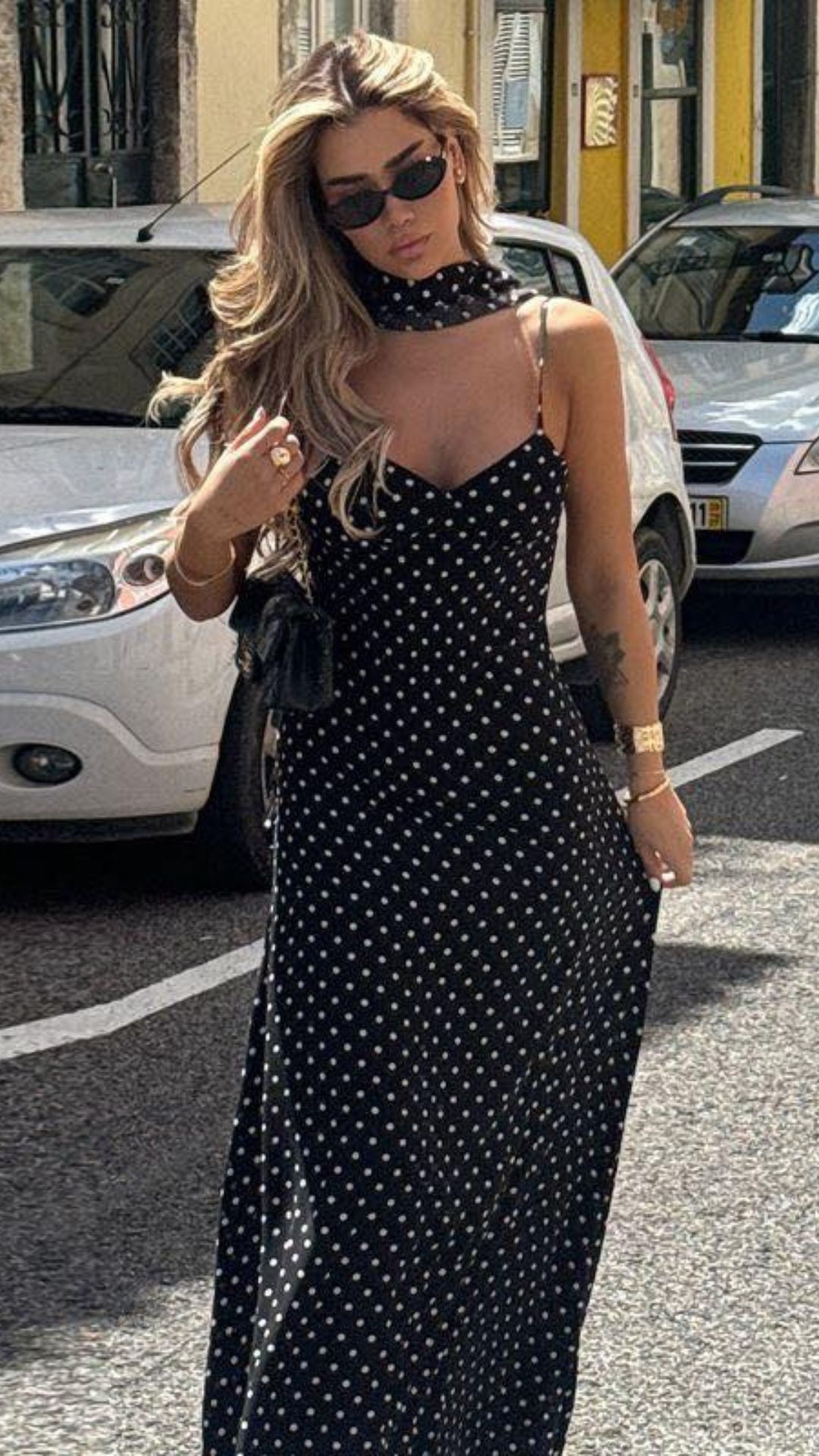 Paired with black sunglasses for a chic look and white strappy heels to elevate the style, this outfit exudes sophistication. The classic black and white polka dot pattern adds a timeless charm that’s perfect for evening events.