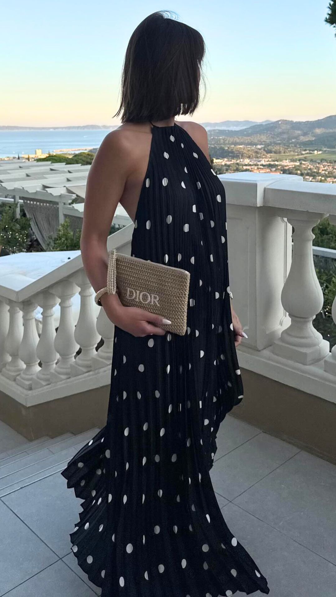 This stunning white pleated dress is the perfect choice for a night out, showcasing bold black polka dots that add a playful yet sophisticated touch. The halter neckline elegantly frames the shoulders, while the flowing silhouette grazes the floor, ensuring a graceful presence.
