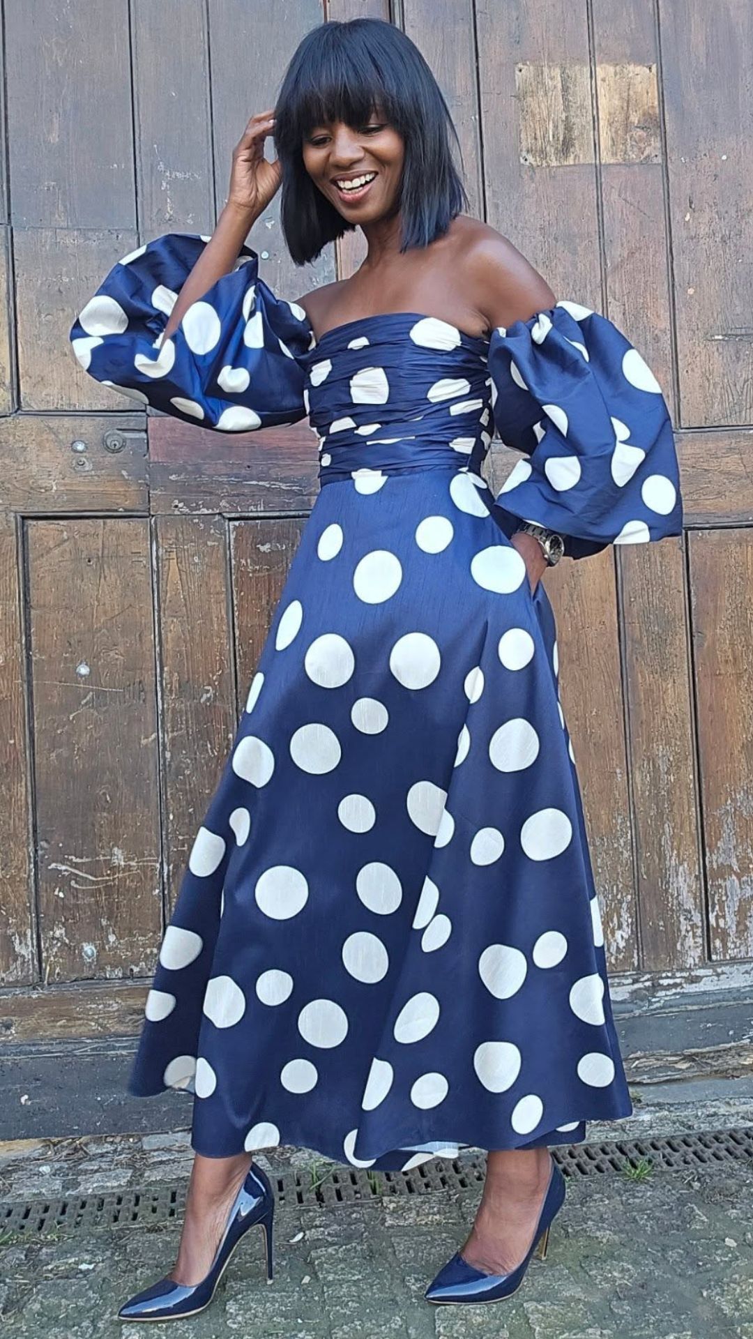 This stunning navy polka dot dress is an ideal choice for a night out, seamlessly blending elegance with a touch of whimsy.