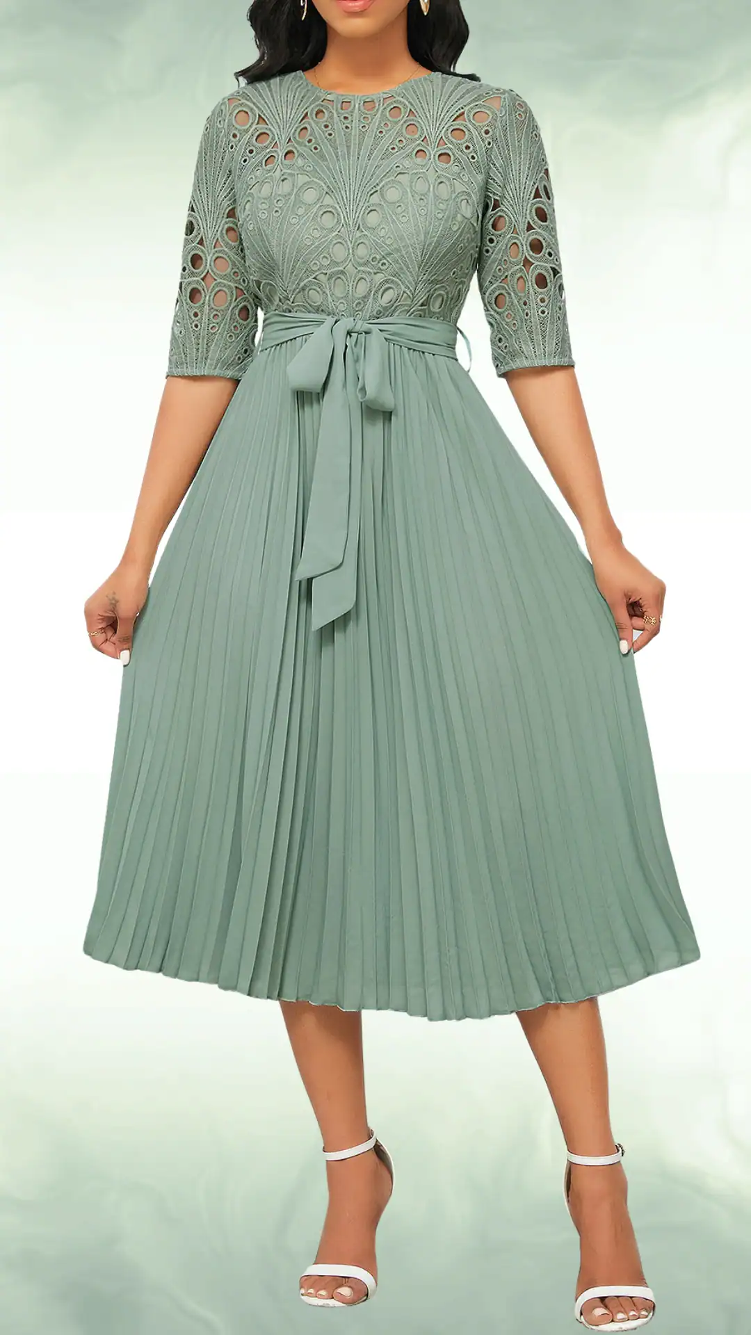 This sage green fall wedding guest dress beautifully combines a romantic lace bodice with intricate cut-out detailing, allowing it to stand out at any formal event. The three-quarter sleeves add an element of sophistication, making it an ideal choice for teenage girls looking to make a stylish impression.