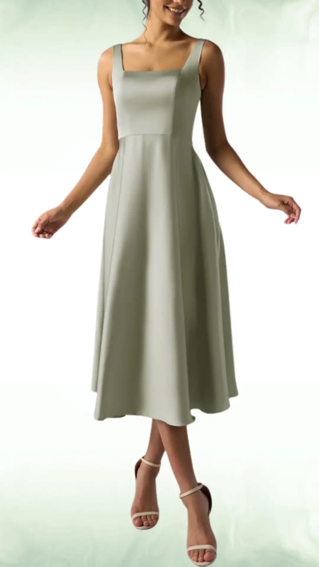 This stunning sage green dress emphasizes modern elegance with its squared neckline and delicate straps. Crafted from luxuriously smooth fabric, it drapes to a midi length, ensuring a beautiful A-line silhouette that flatters a range of body types.
