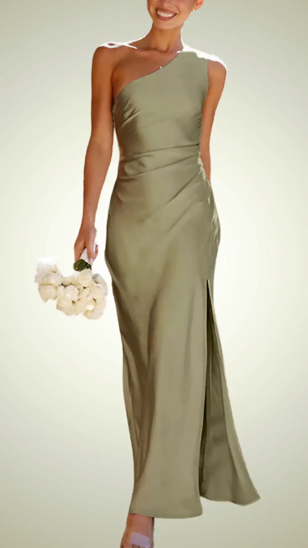 This stunning sage green, one-shoulder dress seamlessly marries elegance with modern flair. The sleek, smooth fabric drapes beautifully, creating a graceful silhouette that flatters various body types.