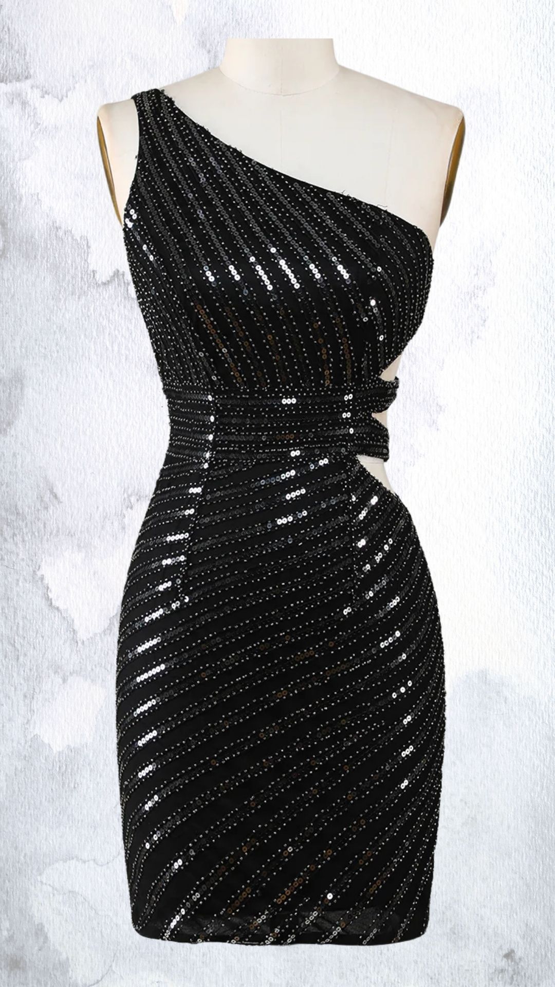 Embellished with shimmering black sequins arranged in vertical stripes, it creates a captivating visual effect as you move. The contemporary cutouts at the waist bring a modern flair, enhancing its chic design.