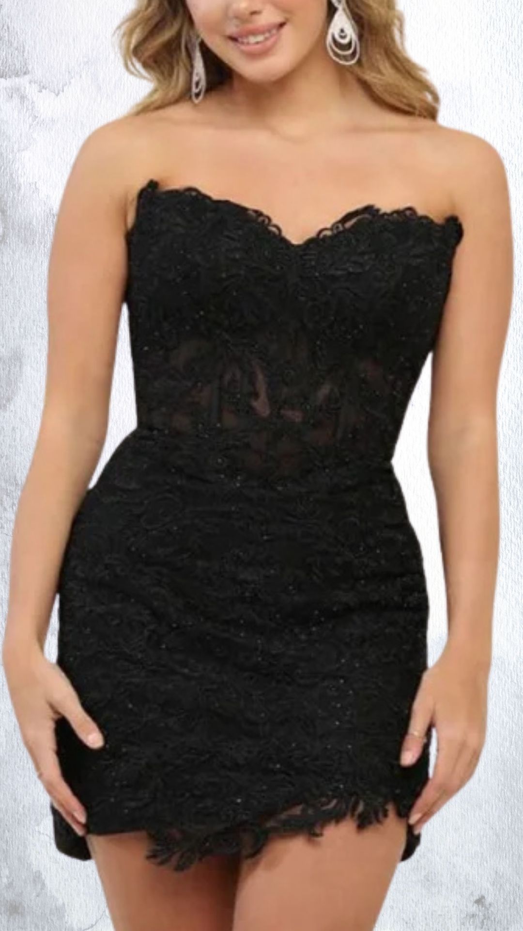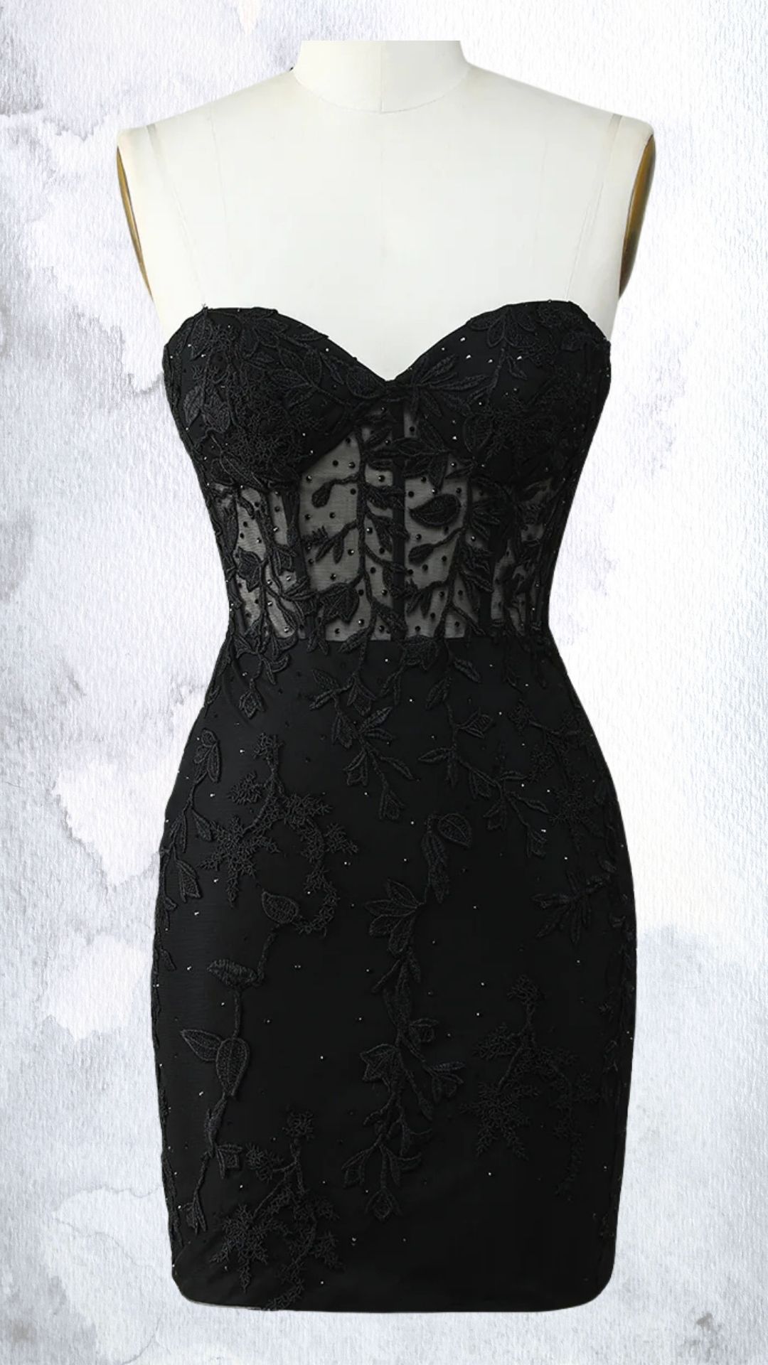 This exquisite short black dress boasts a stunning form-fitting silhouette, accentuated by a charming sweetheart neckline and a sheer mesh bodice. The dress’s sparkling rhinestones beautifully catch the light, adding a touch of glamour that’s perfect for any night out.
