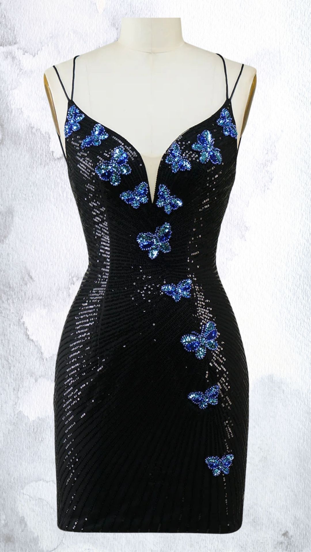 This enchanting black dress offers a form-fitting silhouette that flatters your figure and turns heads. Adorned with blue sequins arranged delicately in the shape of butterflies, it adds a unique and whimsical element to its overall design.